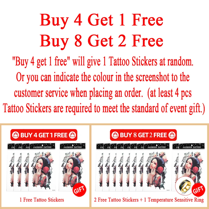 «Купи 4 ПОЛУЧИ 1 бесплатно» дадим 1 тату-наклейки наугад. Или вы можете указать цвет на скриншоте в службе поддержки клиентов при размещении заказа. (по крайней мере, 4 наклейки на татуировки должны соответствовать стандарту подарка события.)Пожалуйста, обратите внимание на размер кольца при размещении заказа, в противном случае мы дадим размер по умолчанию (по умолчанию: для девушек 7, для мужчин 10) Присоединяйтесь к корзине для покупки, вы можете использовать экономичную логистику,Но, пожалуйста, обратите внимание, что отсутствует информация для отслеживания экономической логистики.Для обеспечения своевременности и стабильности логистики рекомендуется выбиратьAliExpress Стандартная доставка.