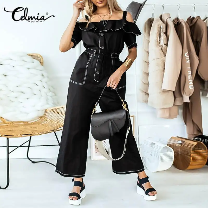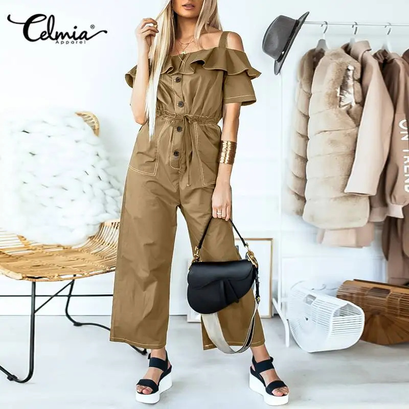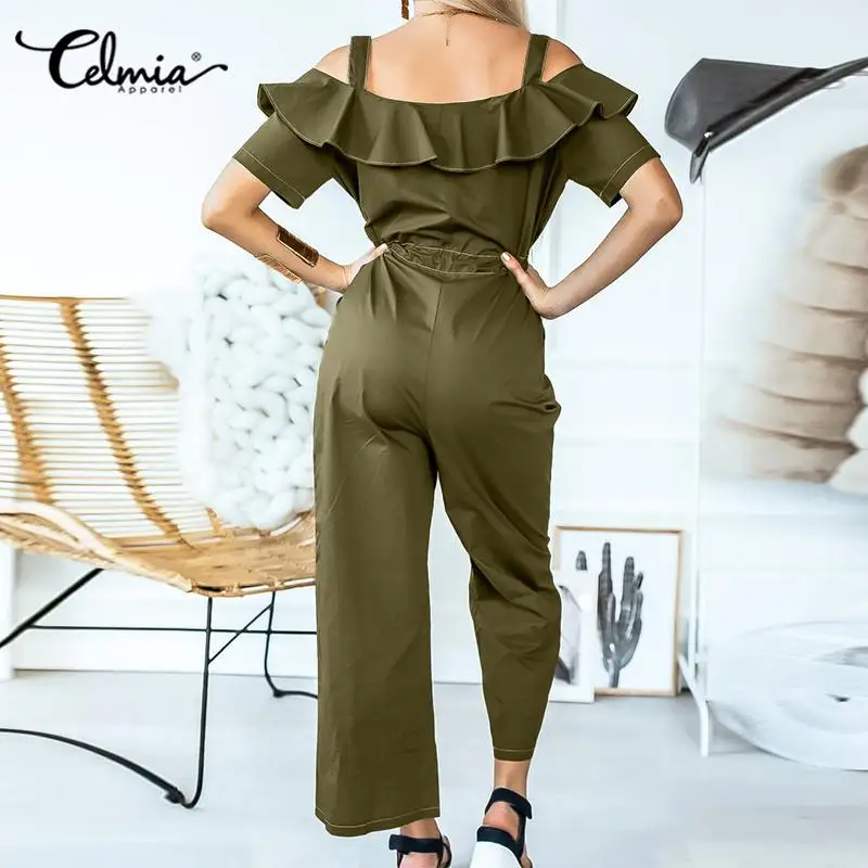 Пикантный длинный комбинезон Celmia с открытыми плечами, женский комбинезон 2021, летние повседневные Рабочие Комбинезоны с коротким рукавом и оборками и брюками-карго с высокой талией