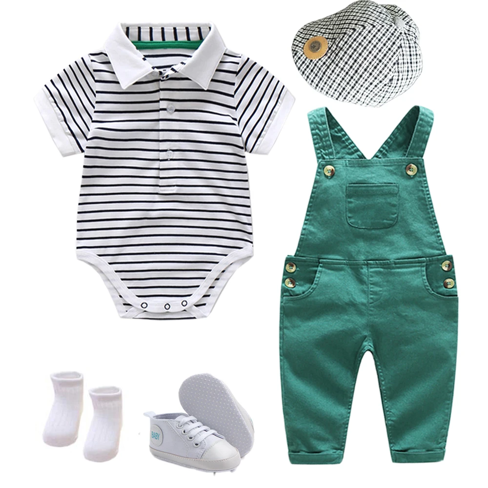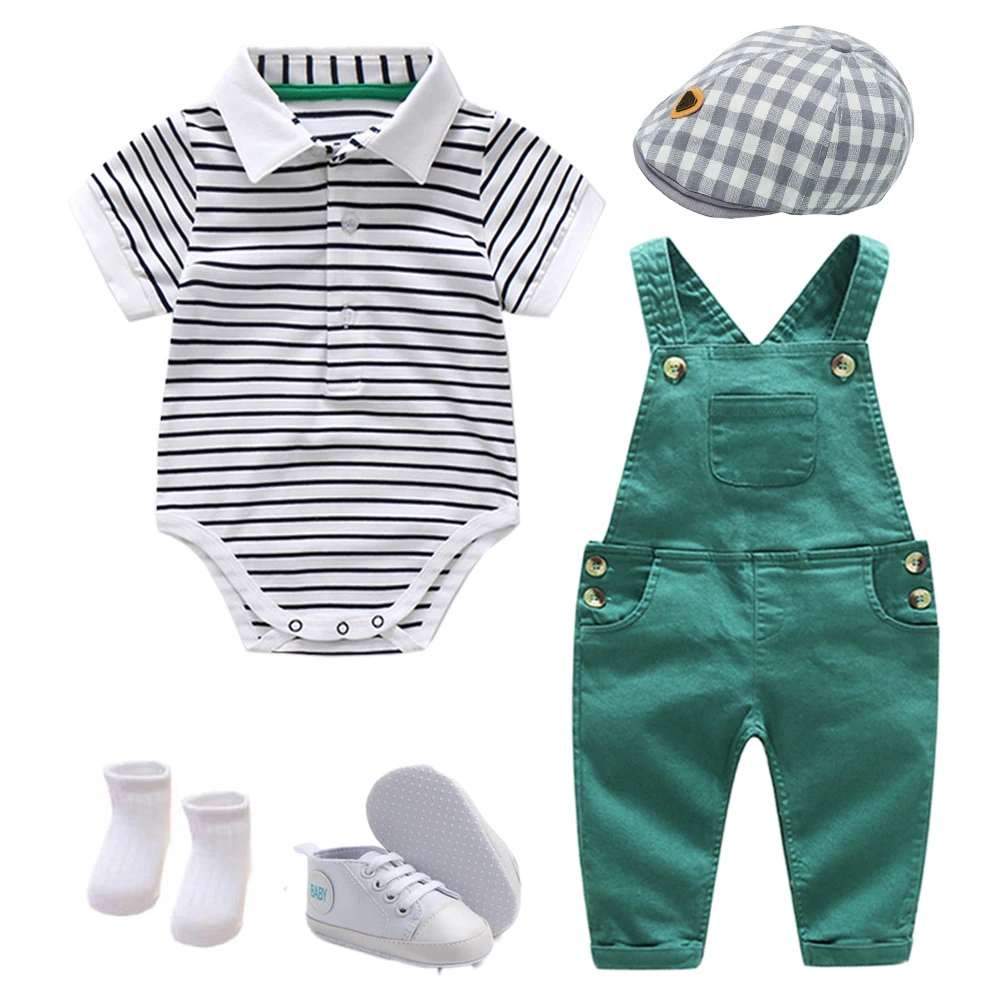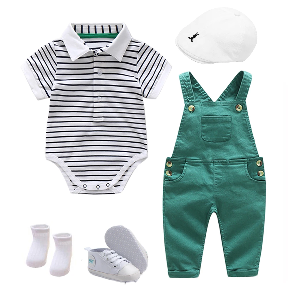Летний костюм с шапочкой для мальчиков комплект детской одежды, хлопковая шапочка + комбинезон в полоску + зеленый джемпер + обувь + носки Повседневная детская одежда из 5 предметов