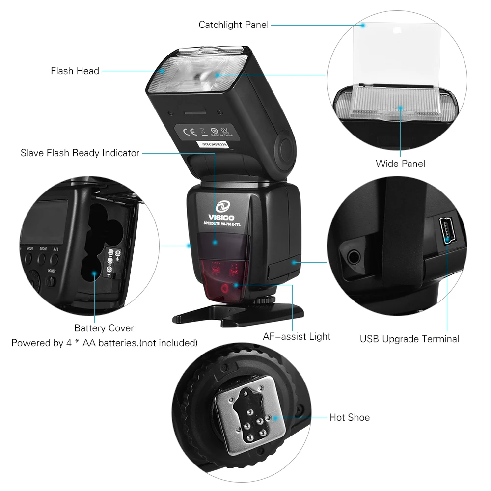 Покрытие вспышки 24-105 мм; Диапазон мощности от 1/1 до 1/128 мощности; Цветовая температура 5600k ± 200K. Функция автоматического отключения питания; Usb-порт для обновления прошивки. Питание от 4 * батареек AA. (батареи не входят в комплект.)