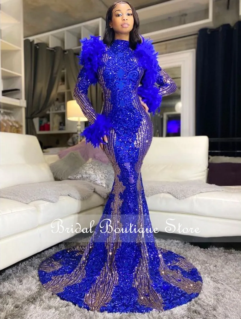 Платье для выпускного вечера с блестками и перьями, королевский синий вечерний наряд с длинным рукавом, с юбкой-годе, черный цвет, для девушек, для дня рождения, блестящее вечернее платье