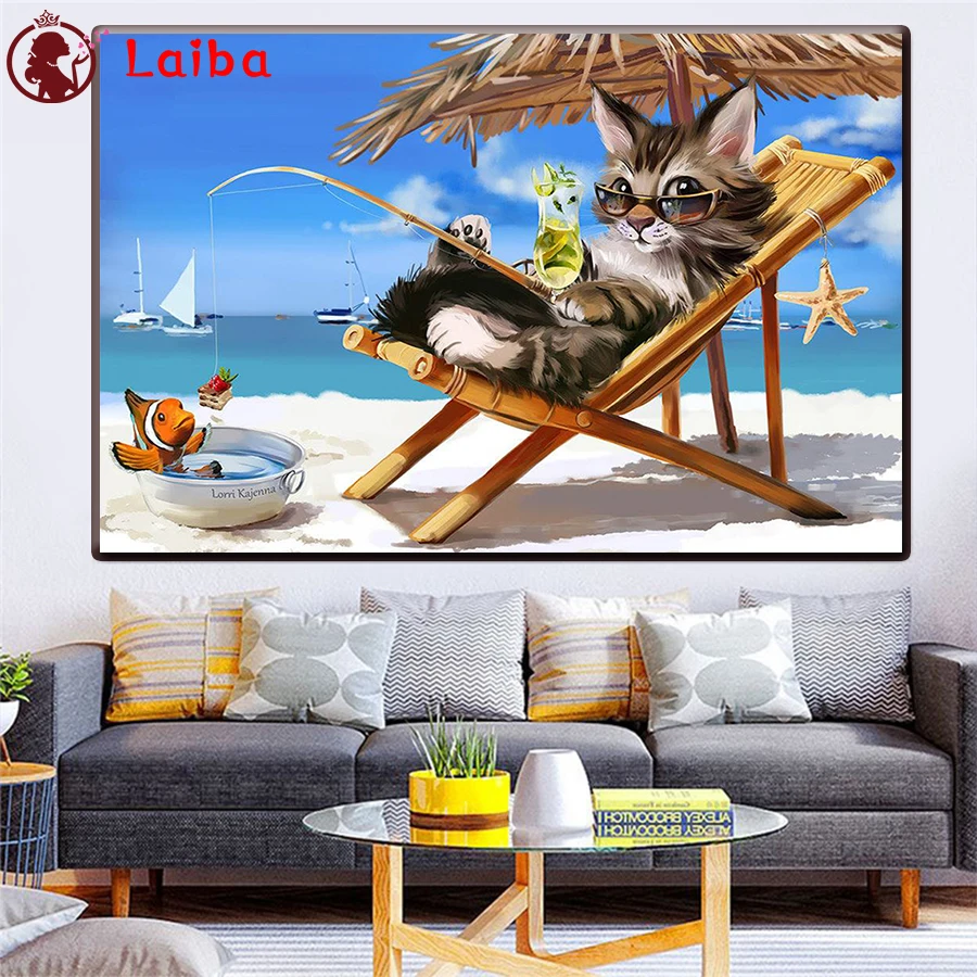 Алмазная 5D Вышивка сделай сам в подарок, алмазная живопись, Пляжная рыбалка, кот, вышивка крестиком, квадратные стразы, мозаичное украшение