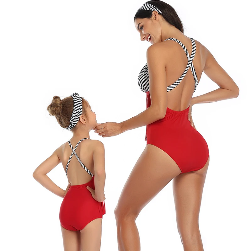 Женский слитный купальник с высокой талией и полосатым принтом, летний купальник с кисточками для девочек, бикини для ребенка, мамы и дочери, купальник с открытой спиной