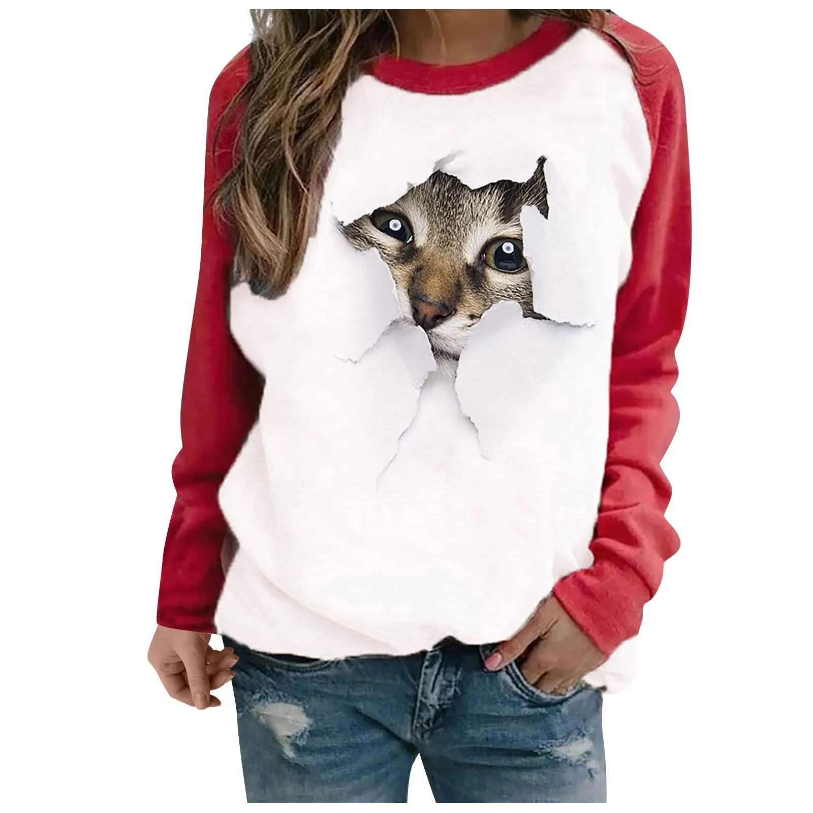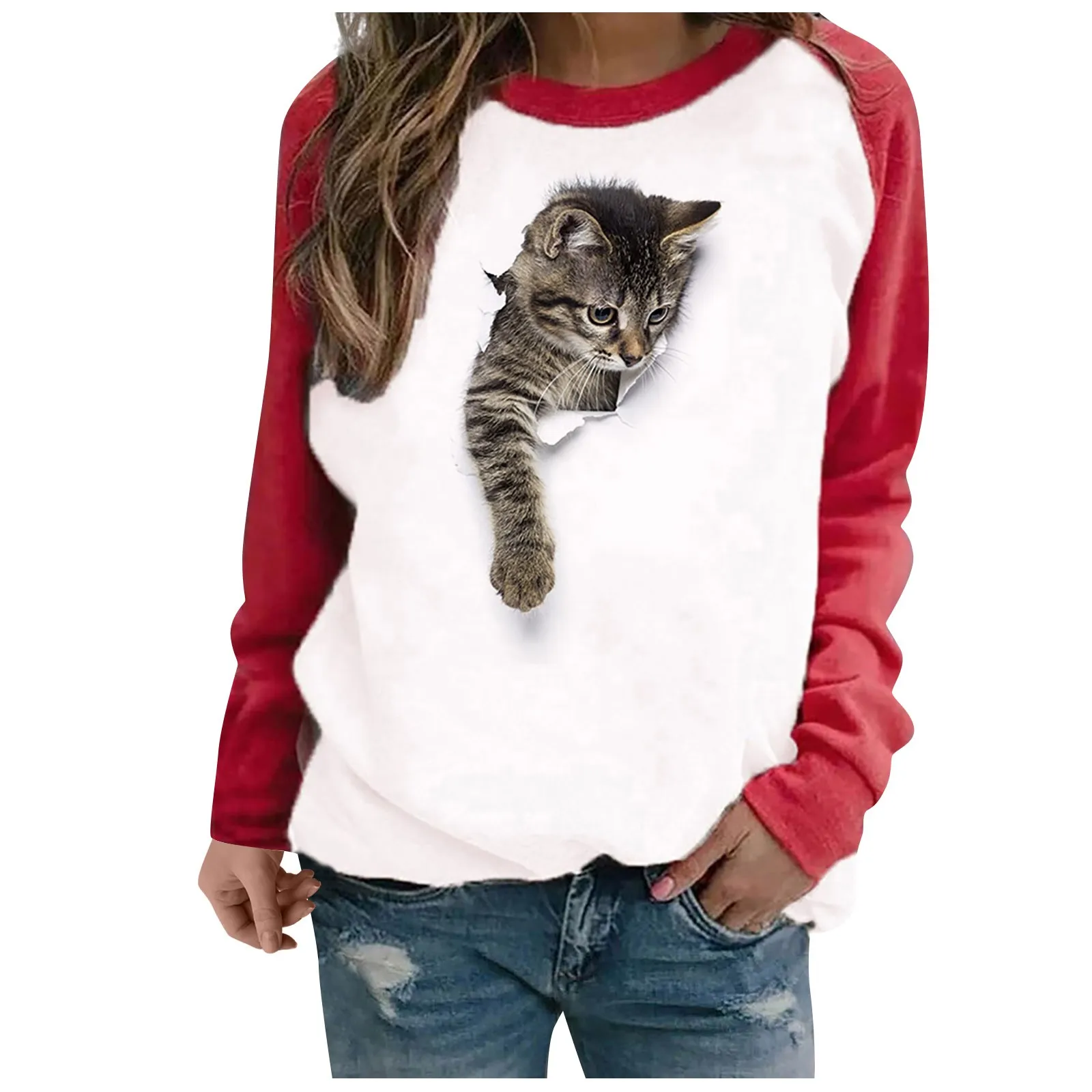 Женская футболка с 3d принтом кота 40 #, повседневный сексуальный пуловер, свитер с длинным рукавом, футболка, пэчворк, мультяшная Весенняя футболка