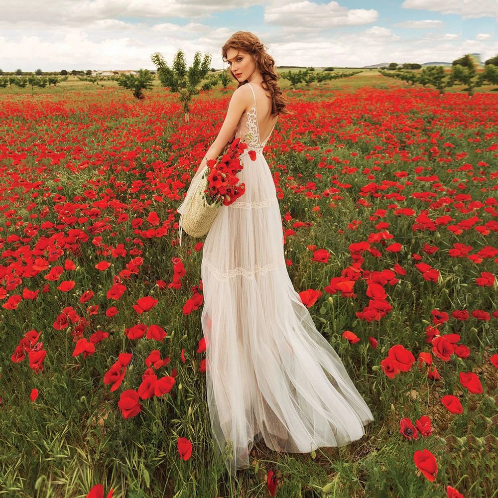 UZN Boho кружевное Тюлевое свадебное платье трапециевидной формы с v-образным вырезом и бретельками, свадебные платья с открытой спиной, Пляжное платье невесты на заказ