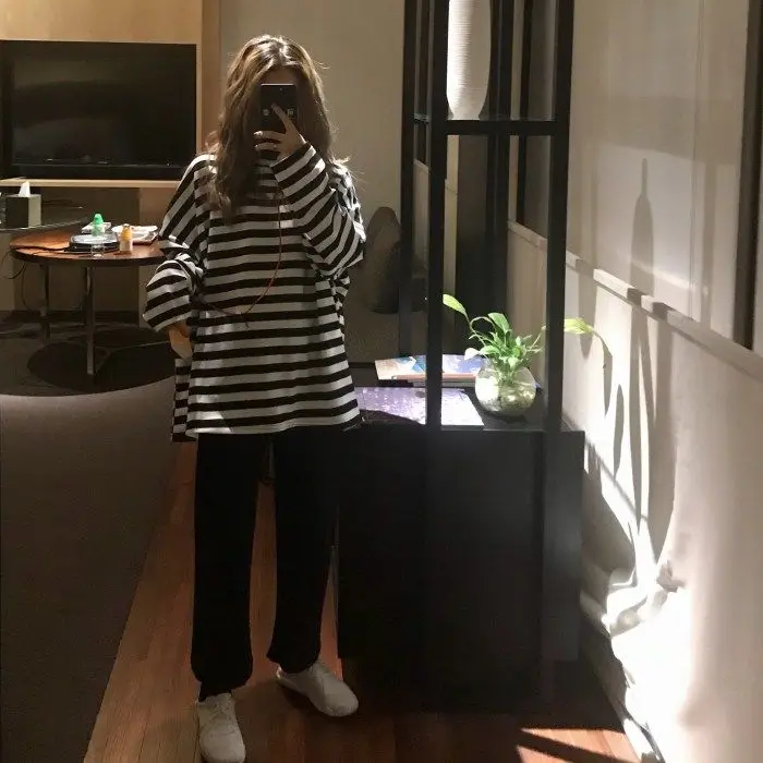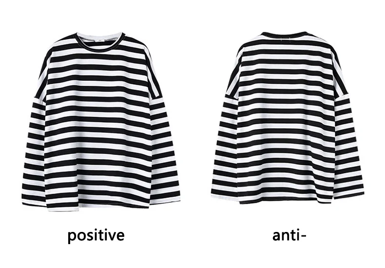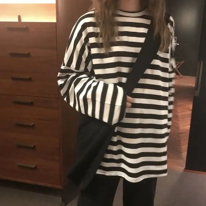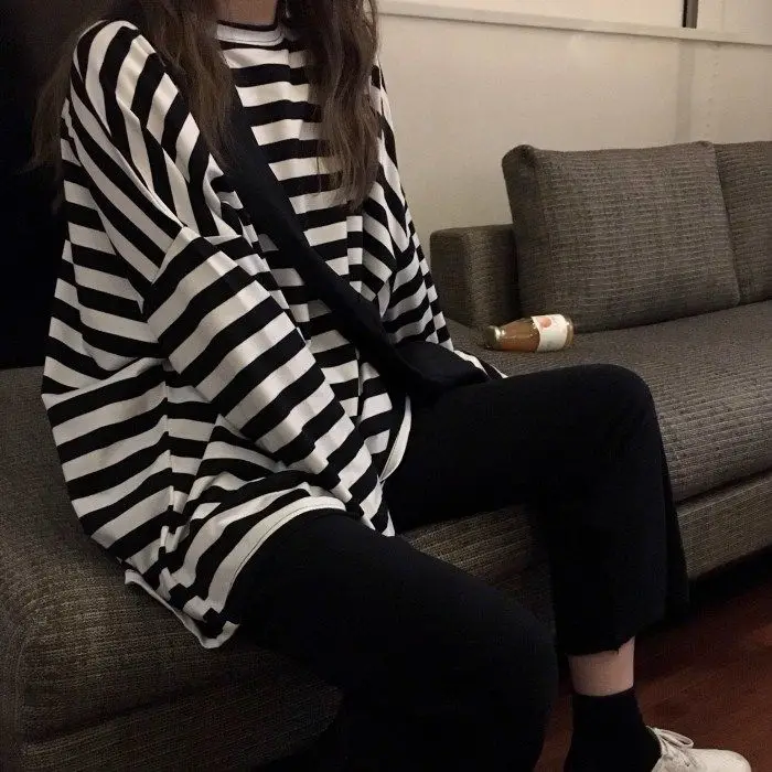 Футболка женская в стиле Харадзюку, полосатая футболка в стиле оверсайз с длинным рукавом и круглым вырезом, повседневный черный топ в Корейском стиле, весна-осень