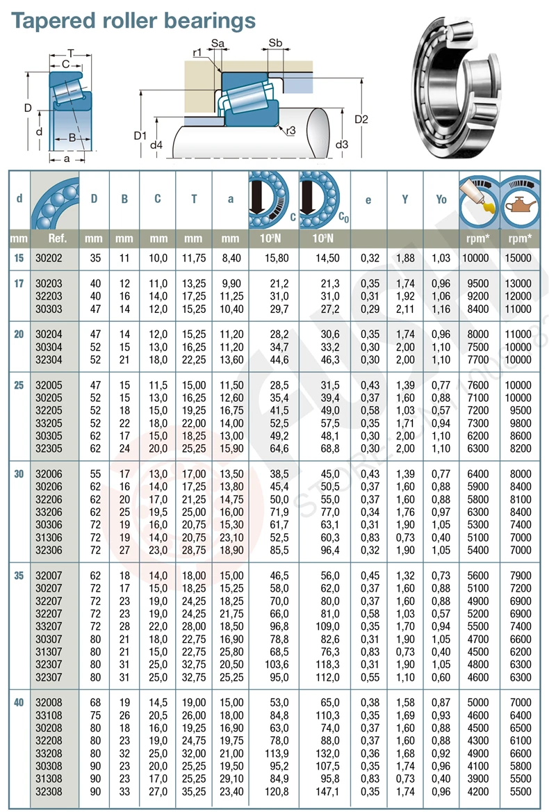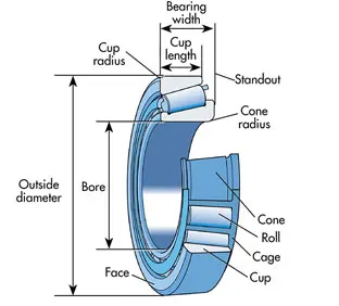 Конические роликовые подшипники состоят из внешнего кольца, внутреннего кольца, роликов и клетки. Этот подшипник содержит конические ролики для своего качения, которые ориентированы на внутреннее кольцо задней стороны ребра на роликовой большой торцевой стороне. Рейсовые поверхности внутреннего кольца и внешнего кольца, а также контактная поверхность роликов для качения спроектированы таким образом, чтобы соответствующие апексы сойдутся в точке на центральной линии подшипника. Подшипники делятся на стандартные, Промежуточные и крутые типы, в соответствии с их углом контакта. Чем больше угол контакта, тем больше сопротивление подшипника осевой нагрузке.