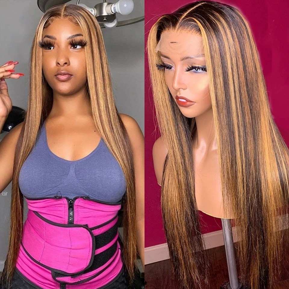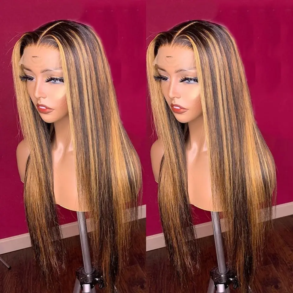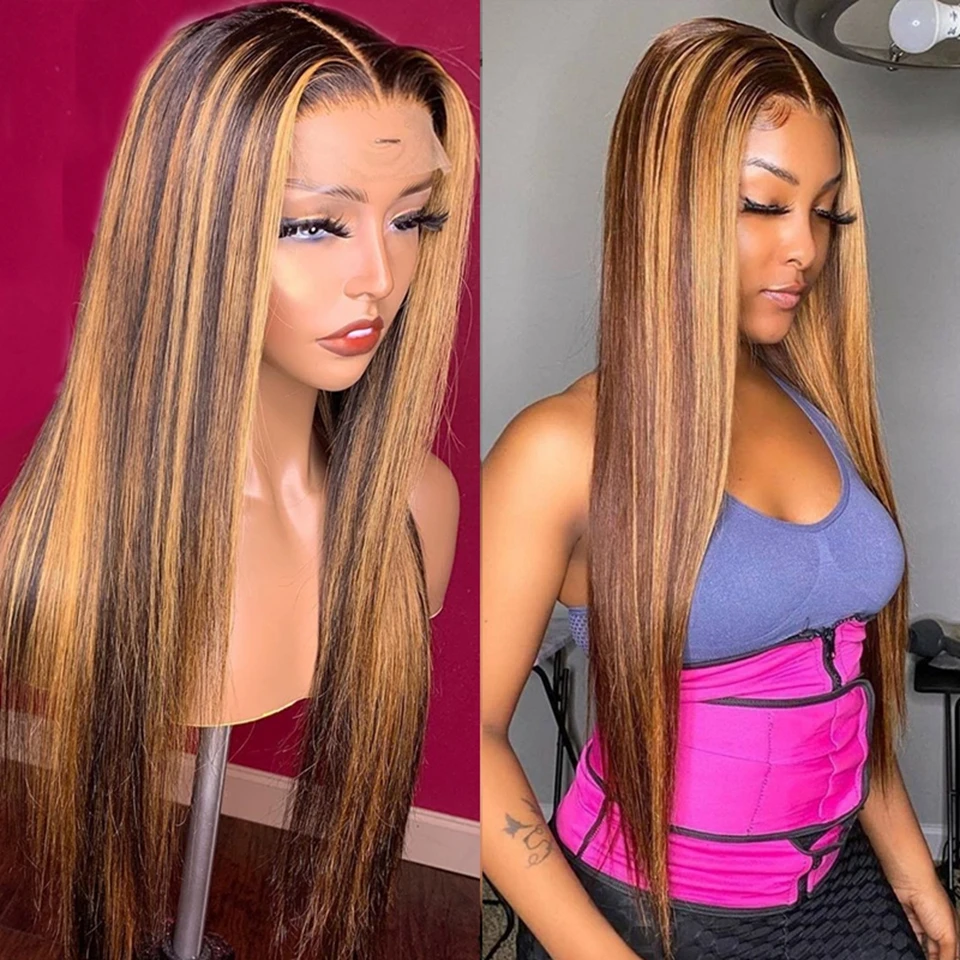 Выделите парик шнурка человеческих волос парики с эффектом деграде (переход от темного к Мёд светлые прямые парики 13x1 Выделите предварите Синтетические волосы на кружеве парики из натуральных волос