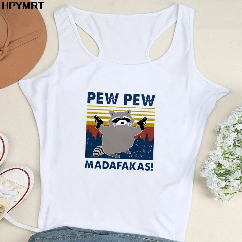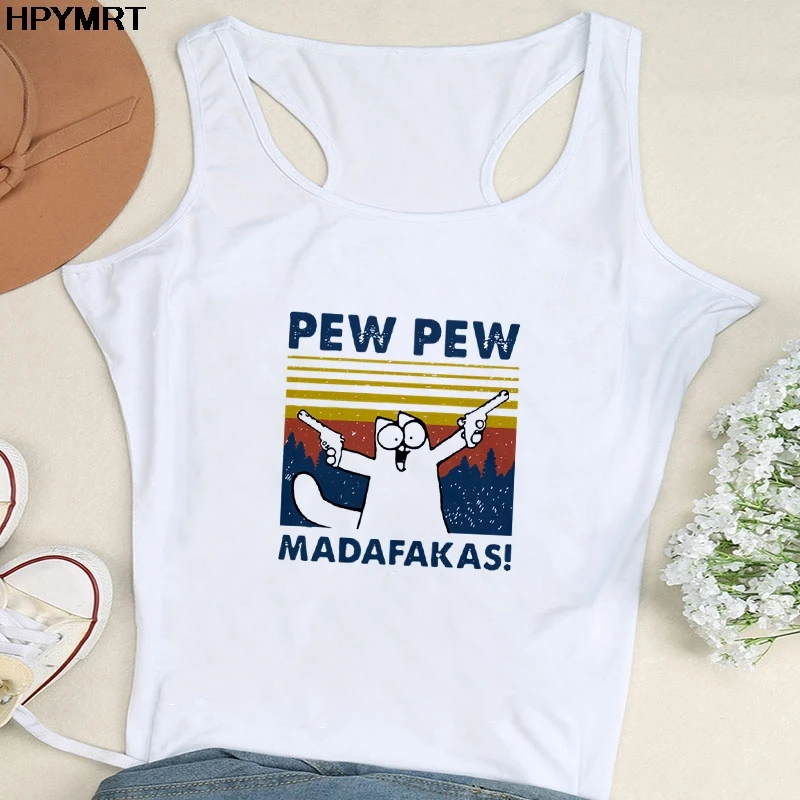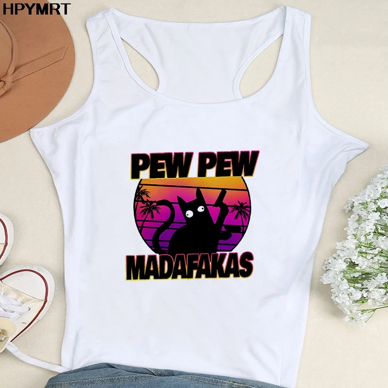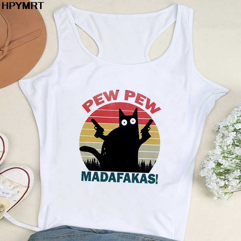 Забавная белая майка с принтом черной кошки с пистолетом, топ Pew M...