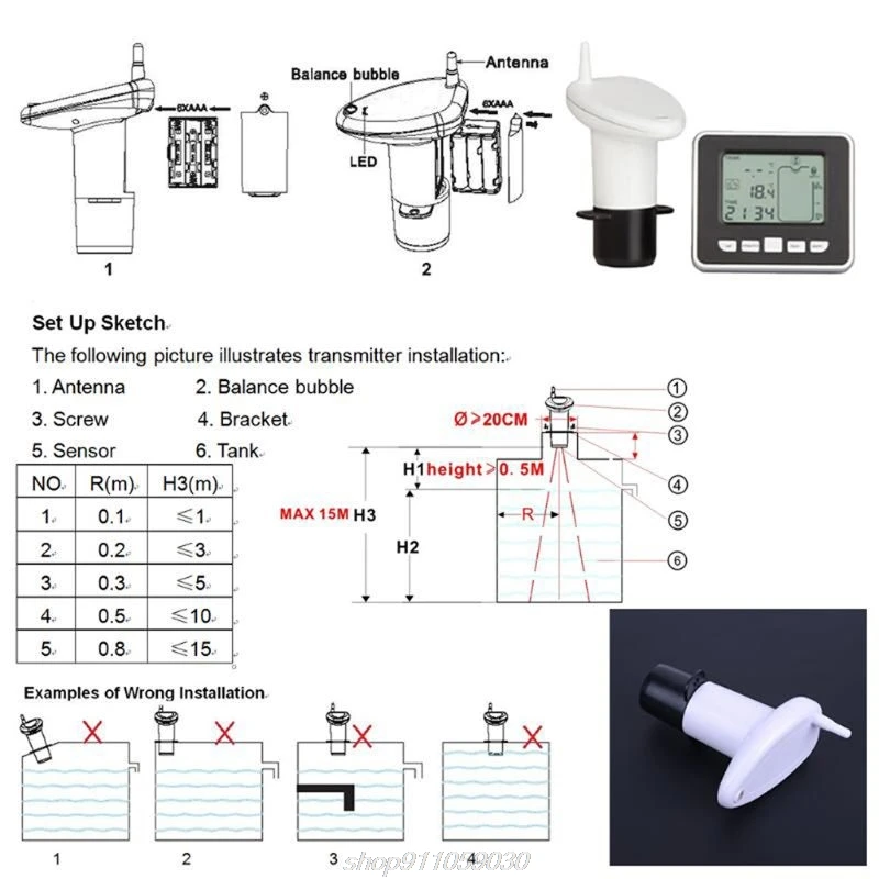 Ультразвуковой измеритель уровня жидкости в резервуаре датчик температуры Низкий уровень заряда батареи индикатор глубины жидкости измерение времени сигнала тревогиОсобенности:Этот счетчик мониторов бака жидкости глубина уровня и отображает на 10-элемент ЖК-дисплей столбчатую диаграммуОн может держать минимальную/максимальную запись уровня жидкости в бакеПоддерживает уровень жидкости в резервуаре высокого/низкого уровня сигнализации и резервуар для жидкостиОтображает температуру в помещении (° или °) и температуру в резервуаре (° или °) одновременноПриемник можно поставить на стол или повесить на стену.Описание:Держите глаз на открытом резервуаре для воды от комфорта вашей собственной гостиной, до 100 м.Установленный в верхней части резервуара для воды, передатчик измеряет уровень воды с помощью ультразвукового датчика и температуры с помощью термо-датчика.Вы можете повесить приемник на стену или вытянуть подставку и разместить ее на кухонной скамейке, столе или столе.Вид вашей комнаты температуры, температуры и датчик уровня воды (представлены в 10 элемент столбчатую диаграмму).Вы можете хранить минимальную/максимальную запись и устанавливать сигналы тревоги для конкретных уровней воды (высокий/Низкий) или когда пустой.Спецификация:Расстояние передачи: Макс. 100 метров (в открытом пространстве) (советы: 1 м = 3,28 футов)Частота: 433 МГцДиапазон температуры в помещении: -50 °-0Разрешение: 1 °Точность: ± 1 °Диапазон измерения температуры бака: -40-60 °Разрешение: 1 °Точность: ± 1 °Диапазон измерения уровня воды: 0-15 м (0-49 футов)Разрешение: 0,01 мТочность: ± 0,03 мПродолжительность будильника: 120 секПотребляемая мощность:Внутренний приемник: 2xAA 1,5 V батареиРезервуар для передатчика: 6 АА 1,5 V батареиРазмер монитора: 10*9*3,5 см/3,94*3,54*1,38 дюймовРазмер передатчика: 15*10 см/5,90*3,94 дюймаВес: 220 гПримечание: 1 м = 3,28 футовПосылка включает в себя:1 * внутренний ЖК-приемник1 * Датчик уровня воды1 * крепежные винты1 * Руководство по эксплуатации