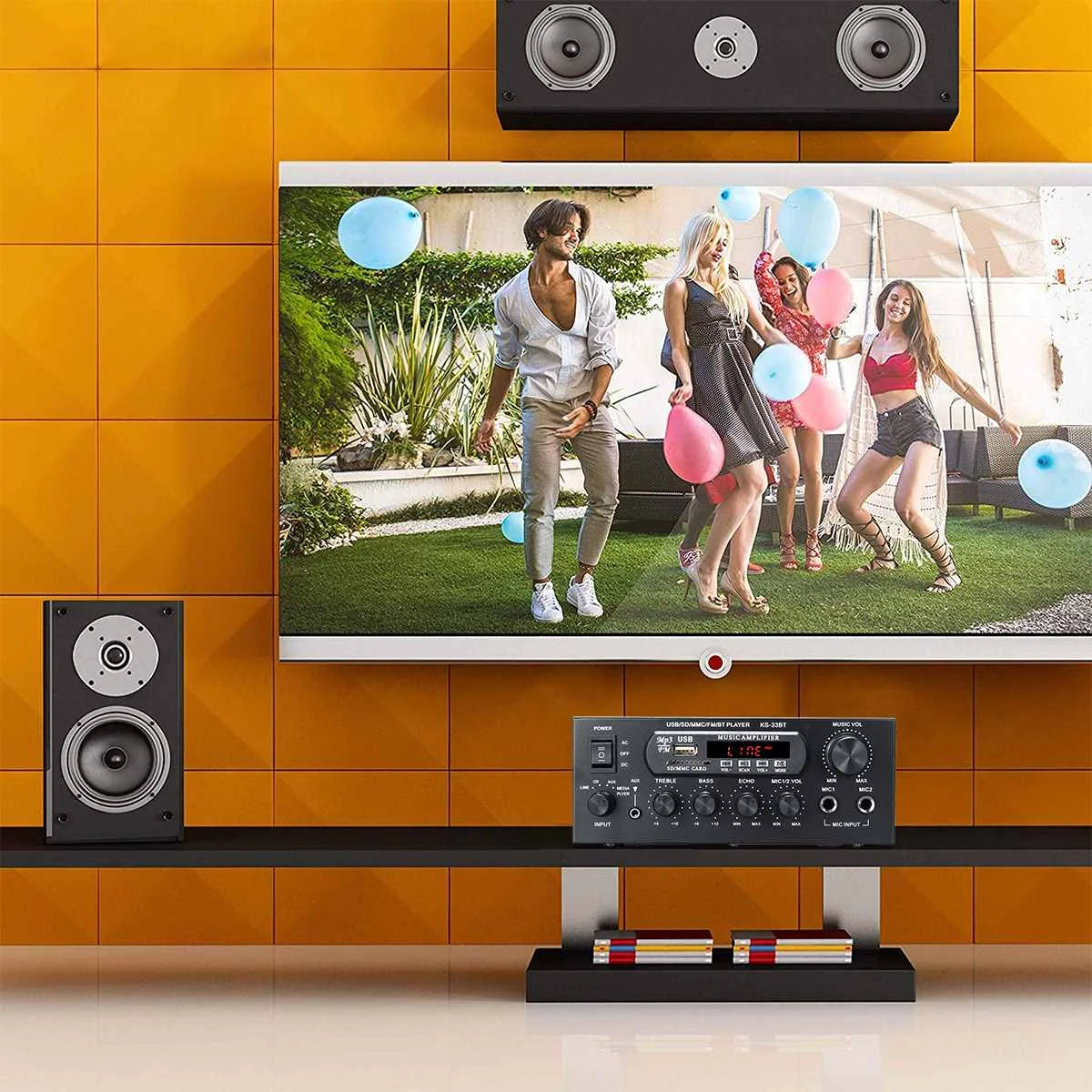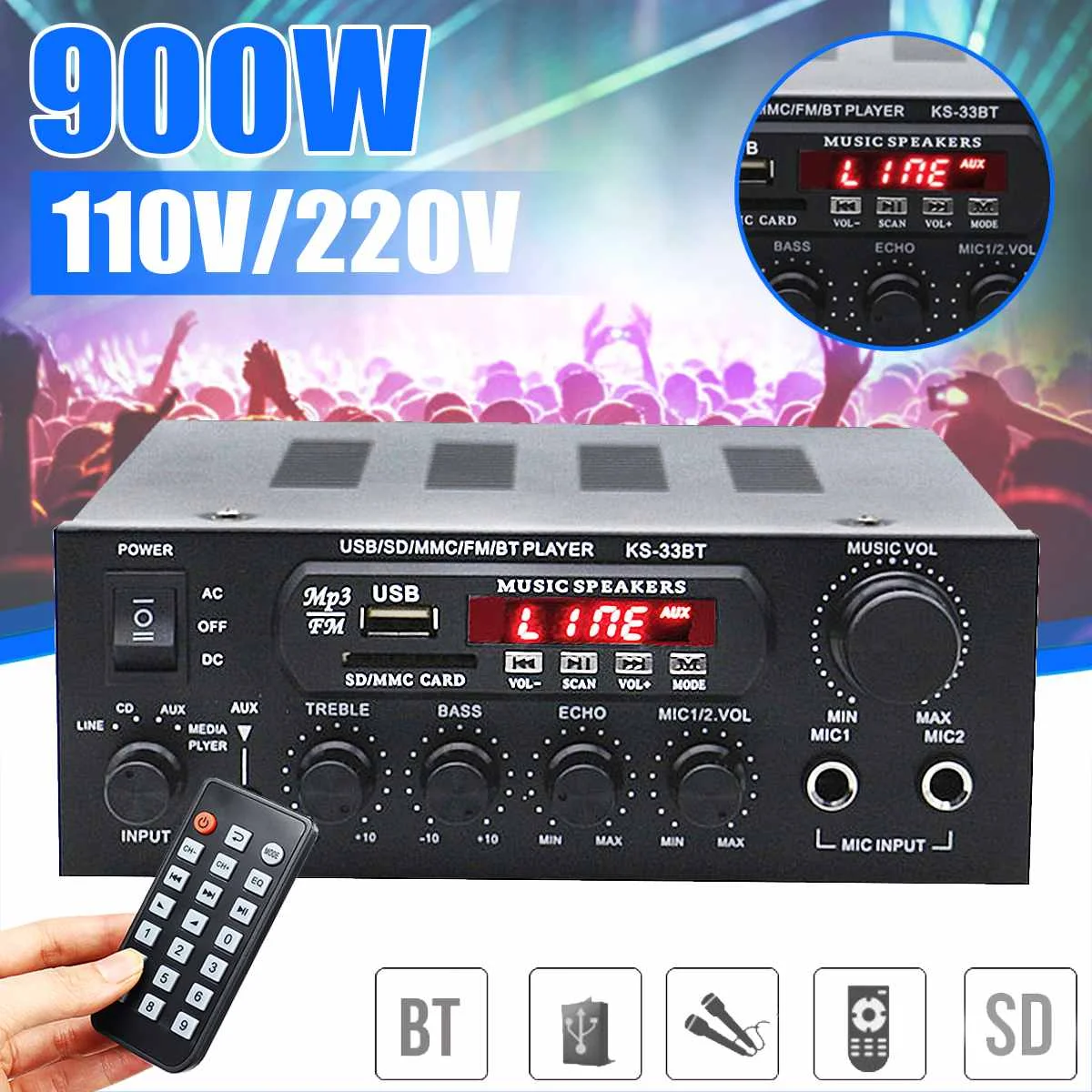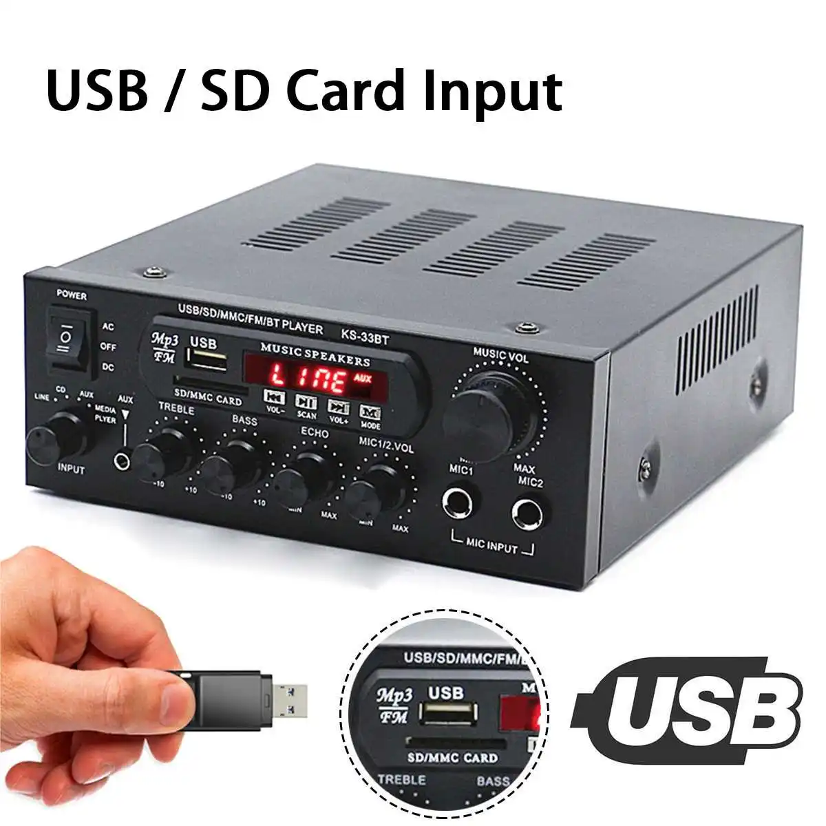 Особенности:-Цифровой mp3-плеер.-Интерфейс bluetooth для потоковой передачи музыки с мобильный телефон-Слот USB / SD для воспроизведения MP3 с карты памяти или карты-Поддерживает fm-стерео радио.-Поддержка 2 way вход для микрофона.-С высокими частотами, басами и регулятором громкости, очень прост в использовании.-Низкое Искажение обеспечивает более четкий, сильный и мощный звук.-2 канальный выход.-С функцией дистанционного управления.-Питание постоянного/переменного тока, подходит для домашнего использования.-Подходит для HiFi, систем домашнего кинотеатра и караоке