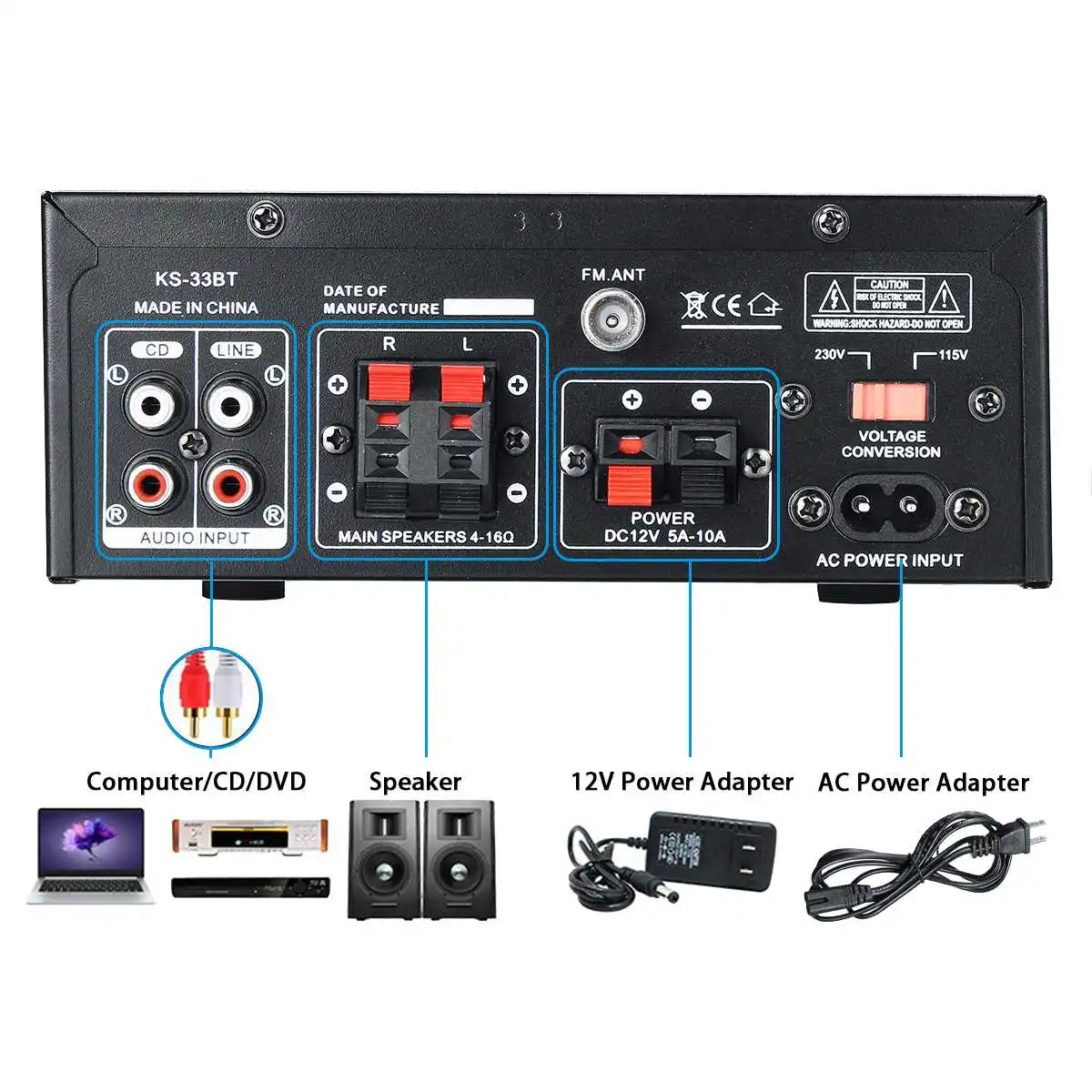 Характеристики:Модель: 33BTЦвет: черныйНоминальное напряжение: DC12V AC115-230V(110-220 В также можно использовать)Номинальная мощность: 50 Вт + 50 ВтМаксимальная мощность: 450 Вт + 450 ВтРазрешение: 20-20 кГцУровень искажений: 0,4SNR: ≥ 70 дБСопротивление: 4-16 ОмКанал: 2,0 каналРазмер: 19,3*18*6,5 см/7.6x7.1x2.6inВес: 1,7 кг
