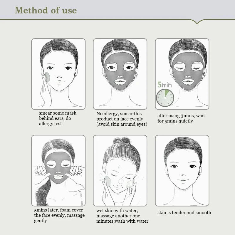 Способ использования 01 смазывает маску за ушами, вызывает аллергию test02 без аллергии, равномерно смазывает этот продукт на лицо (Избегайте кожи вокруг глаз) 03 после использования 3 мин, подождите 5 минут quietly04 5 минут позже, пена равномерно покрывает лицо, массирует мягкую влажную кожу водой, Массажируйте еще одну минуту, мойте водой 06, кожа нежная и гладко теплая, эта маска очищается в глубине, может быть зуд во время процесса, или боль, это физическая реакция, это нормально, очень скоро, не забудьте увлажнить после использования этой маски!