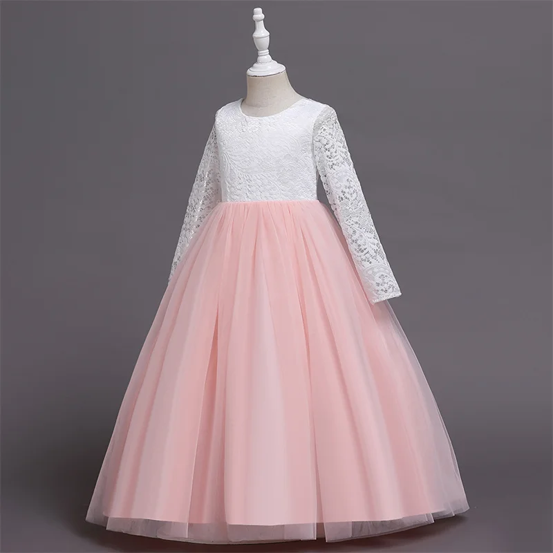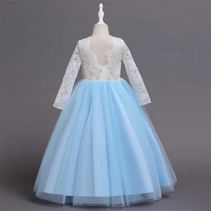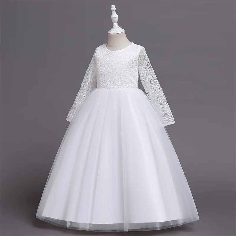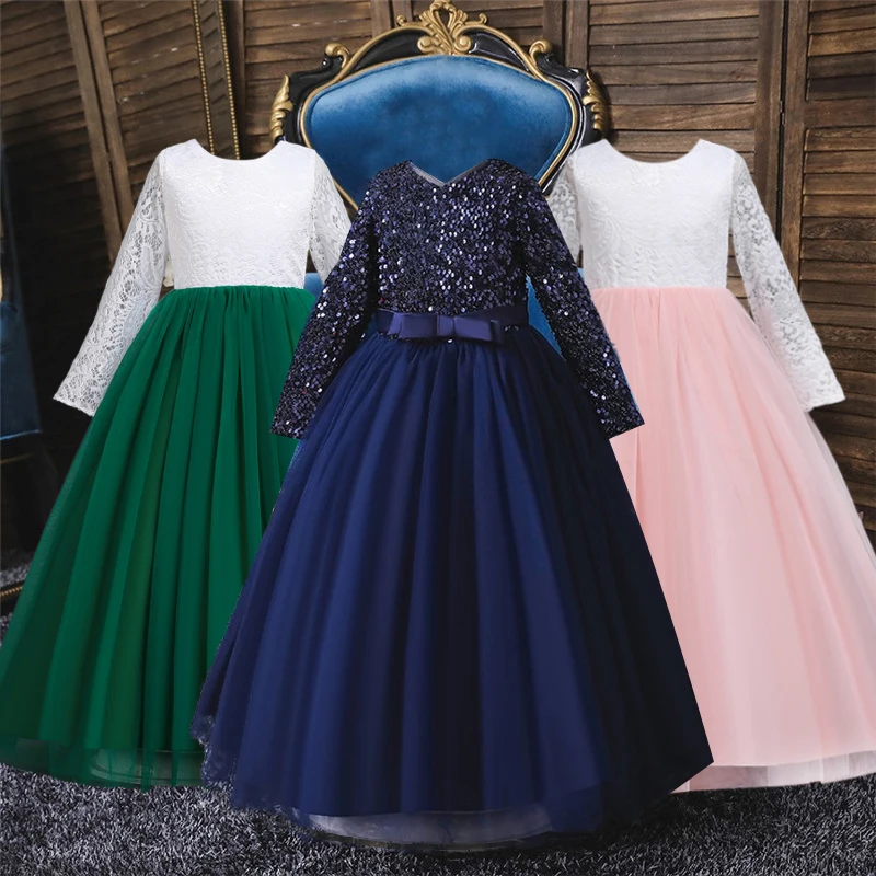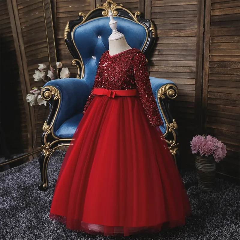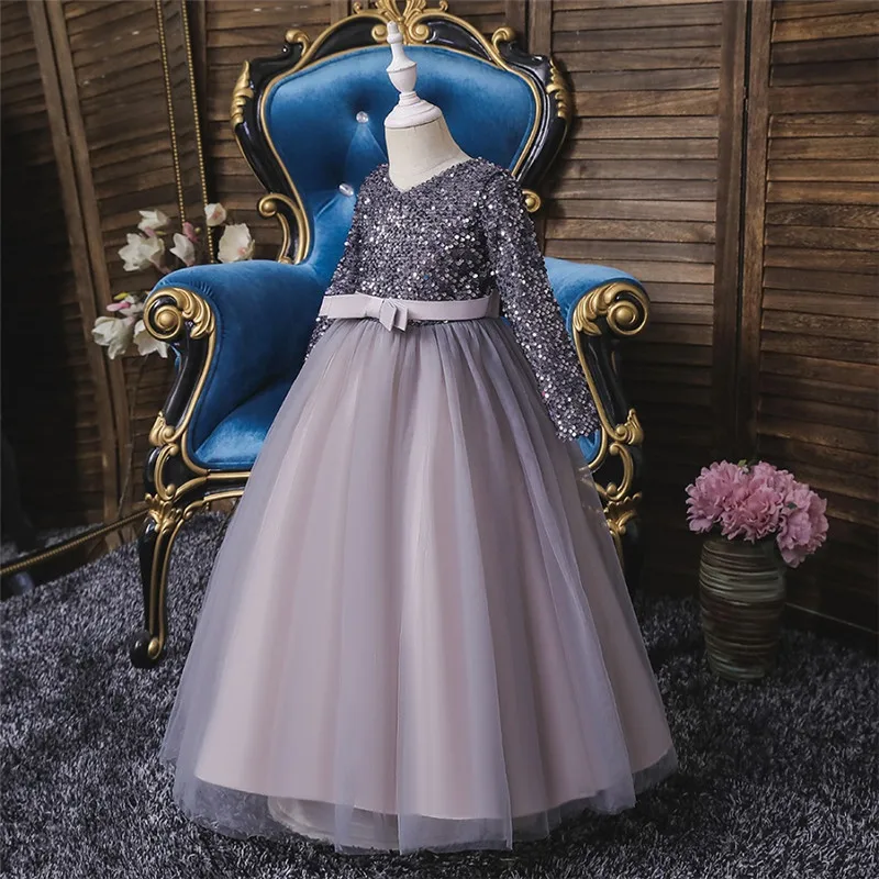 Детское длинное платье с блестками и цветами для свадебвечерние НКИ элегантное праздничное кружевное платье с длинными рукавами и вышивкой для маленьких девочек