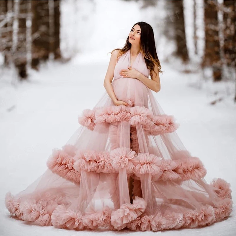 Пышное Тюлевое платье для беременных для фотосъемки или гофрированной тюлевой лямки на шее, розовые халаты для беременных, женское платье для фотосъемки