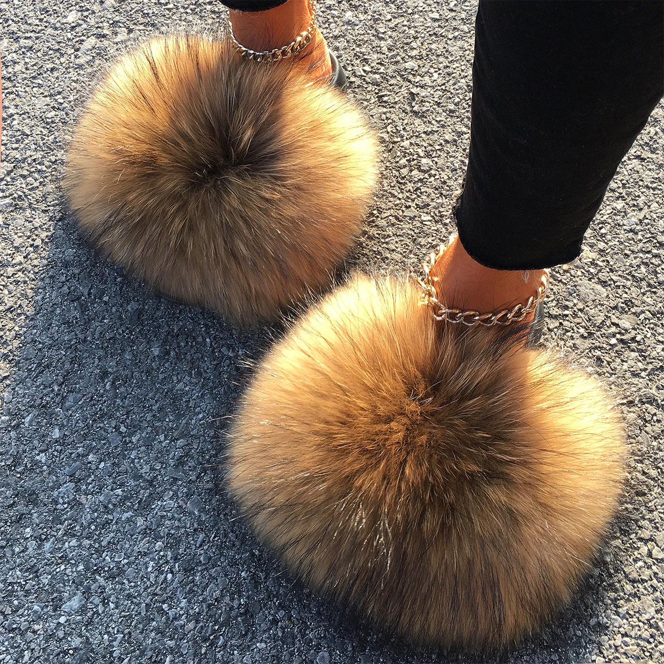 Шлепанцы женские на плоской подошве, сланцы, натуральный мех лисы, енота, пляжные сандалии, Симпатичная плюшевая повязка для волос обувь с мехом, большие размеры