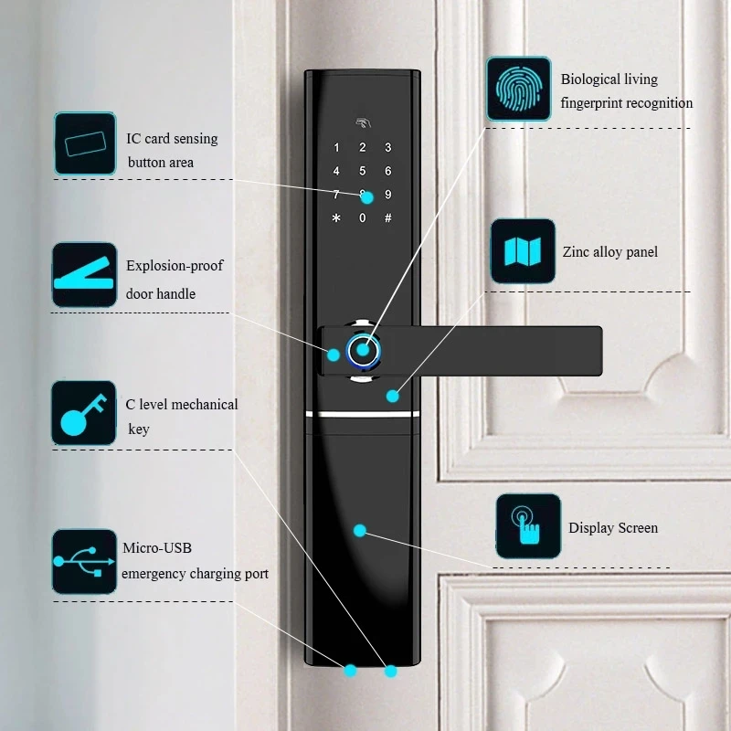1. Поддержка разблокировки приложения (только менеджер), связь Bluetooth сигнала, расстояние в пределах 10 м2. Приложение делает временный пароль, пароль и RFID карты управляются.3.Supprot smart lock collective one-click управление, облегчающее управление домашним владельцем комнаты.4. Поддержка отпечатков пальцев, пароля, RFID карты, механический ключ разблокировки, сделать ваш дом умнее.5. Функция защиты от подглядывания, Улучшенная защита конфиденциальности.6. Функция оповещения о низком заряде батареи: когда аккумулятор истекает, он автоматически выдаст сигнал «didi».7. Избыточный режим ожидания, время работы в режиме ожидания до 365 дней (Источник питания: 4 батарейки типа АА (не входят в комплект).8. Оснащен usb-портом для экстренной зарядки.