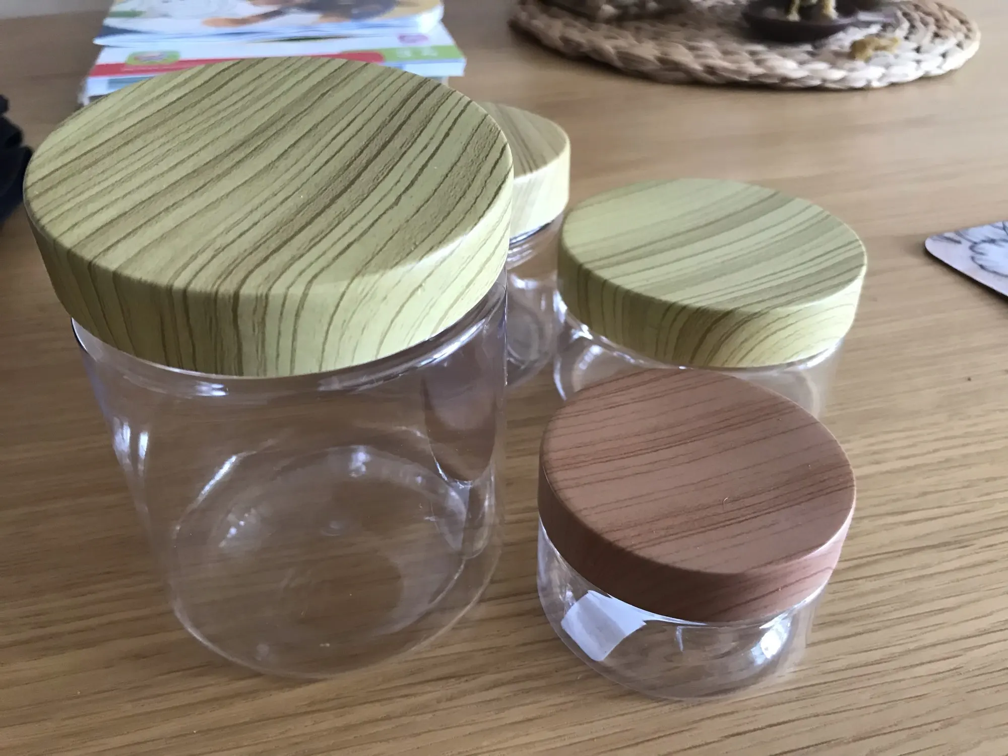 Характеристики:Материал: пластикФорма: круглая бочкаХарактеристики:100 мл имитация древесного зерна,200 мл имитация древесного зерна,300 мл имитация древесного зерна,500 мл Имитация древесины зерна крышкаЦвета: покрытие из древесины, прозрачныйПосылка включает в себя: 1 контейнер