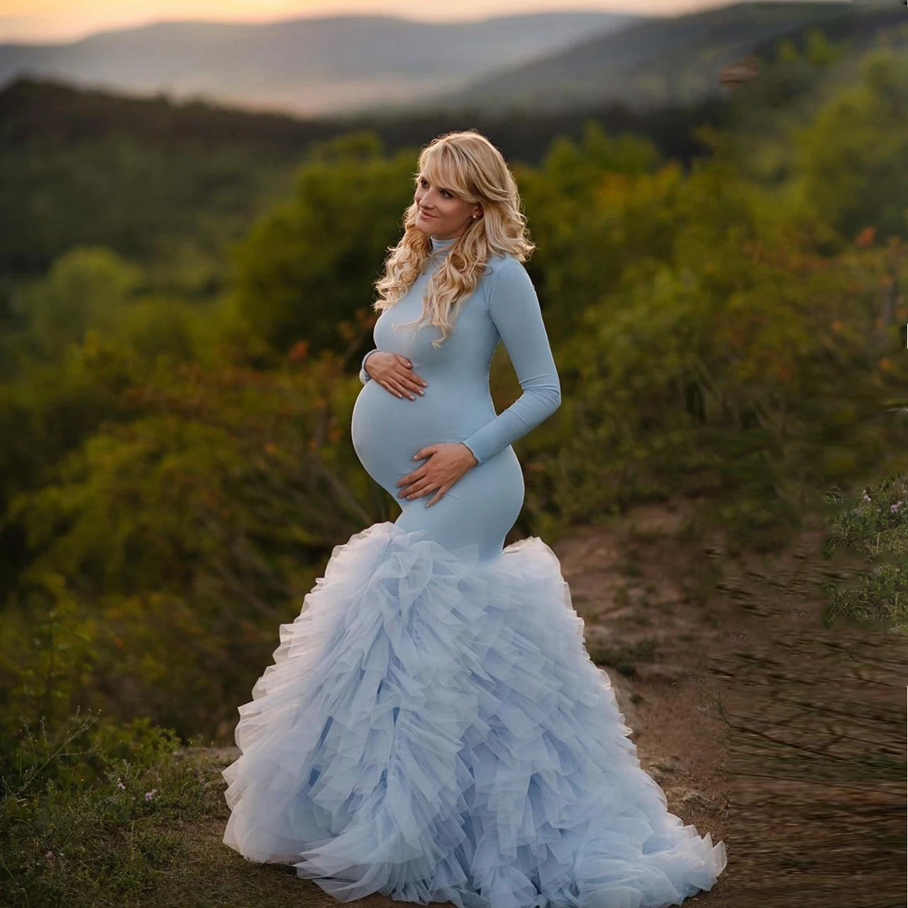 Пыльно-голубое Тюлевое платье для беременных сексуальное длинное пр...