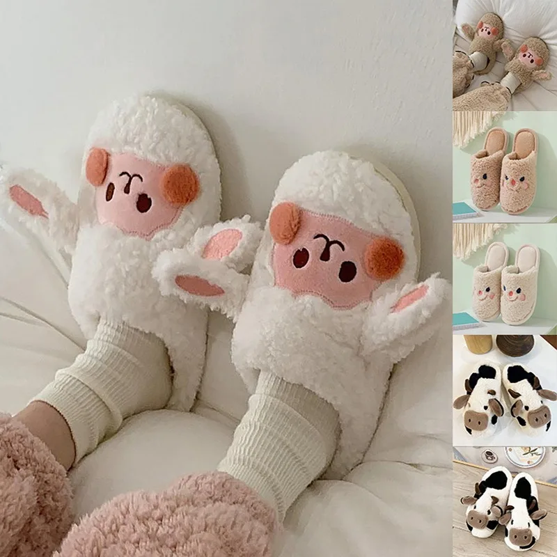 Новинка 2022, женская зимняя теплая плюшевая обувь для дома с милыми мультяшными животными, пушистые сланцы из хлопка