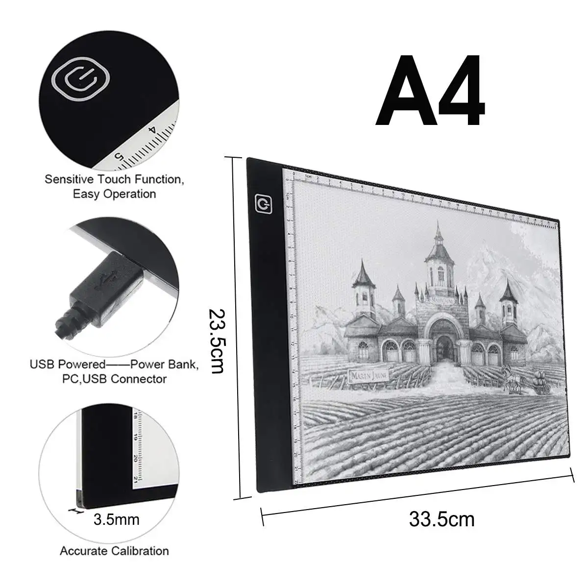Название: 5 В A4 светодиодный светильник для художника с регулируемой яркостью стол для рисования со шкалой каллиграфическая панельМодель: F13966Описание товараМатериал: акрилЦвет: белыйРазмер: 235x335ммНапряжение: 5 ВТип: неполярное Затемнение/трехступенчатое затемнение