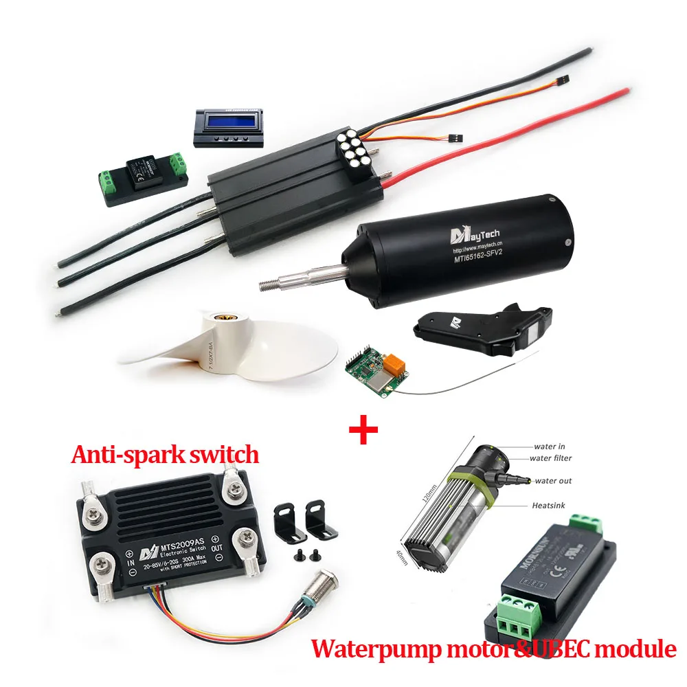 MTI65162-SF IP68 65162 100KV/120KV/195KV мотор + MTSF300A-OPTO брызгозащищенный с водой 300A ESC + Progcard-HA + UBEC-75V + пульт MTSKR1905WF + переключатель MTS2009AS + MTWP30W & MTUBEC6.12 водяной насос & UBEC(Только двигатель с шлицевым валом поставляется с бесплатным пропеллером MTSP72506 7,25*6 дюймов)Выключатель Anti-spark и комплект мотора водяного насоса без разъемов. Обратите внимание. Мы отправим изображение проводки после отправки, пожалуйста, соедините их самостоятельно в соответствии с изображением проводки.