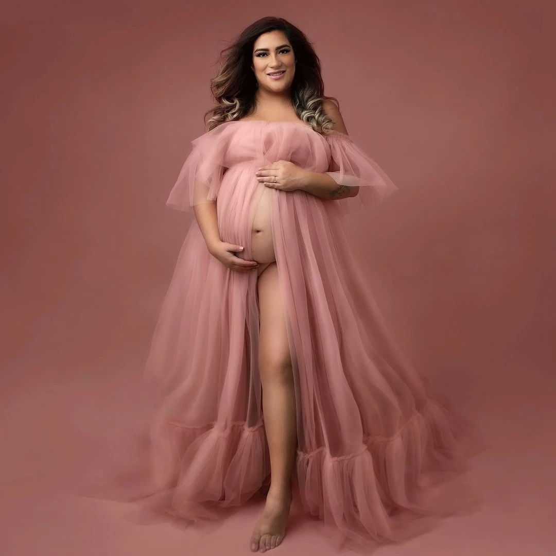 Шикарный Розовый тюлевый халат для беременных платье для фотосессии прозрачное Тюлевое длинное платье с открытыми плечами для будущей мамы женские платья для беременных