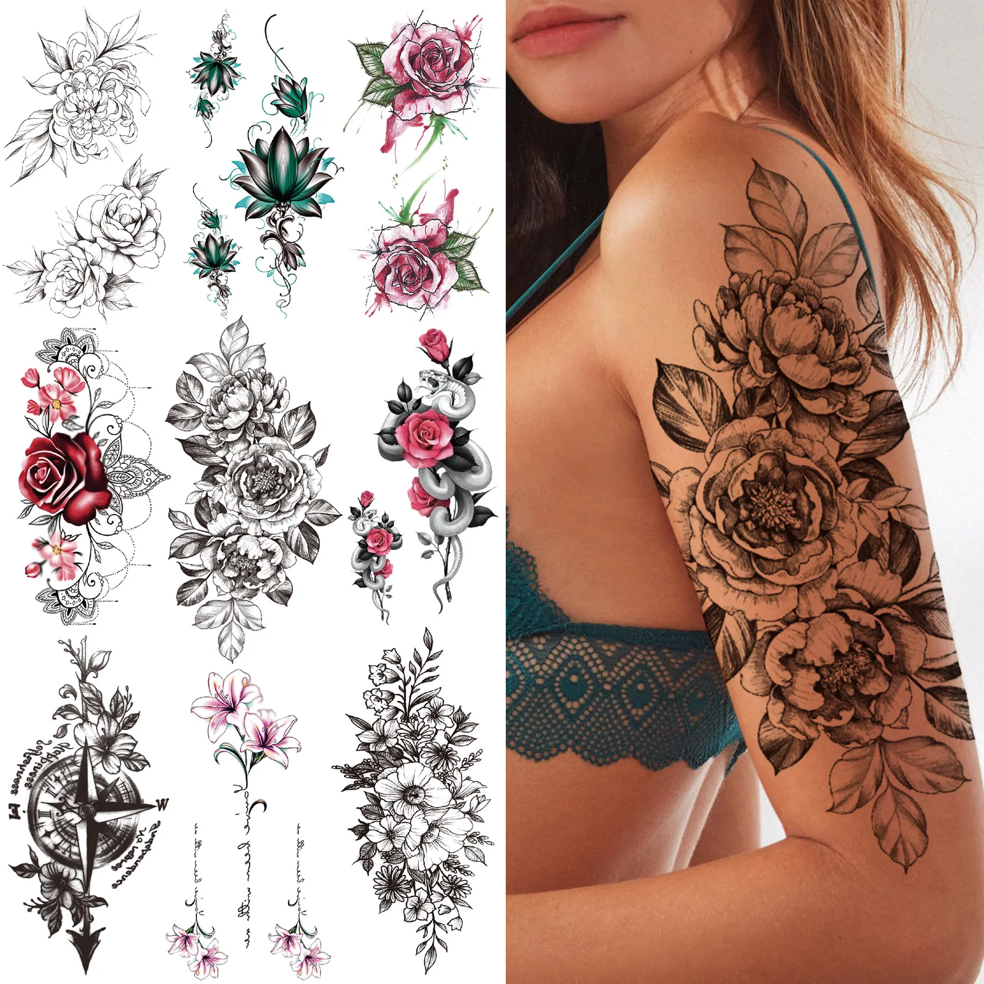 Временная татуировка с черными цветами для женщин и девушек, цепочки с Пионом, компасом, лотосом, тату-наклейка, роза, змея, кружево, искусственные 3D татуировки на предплечье