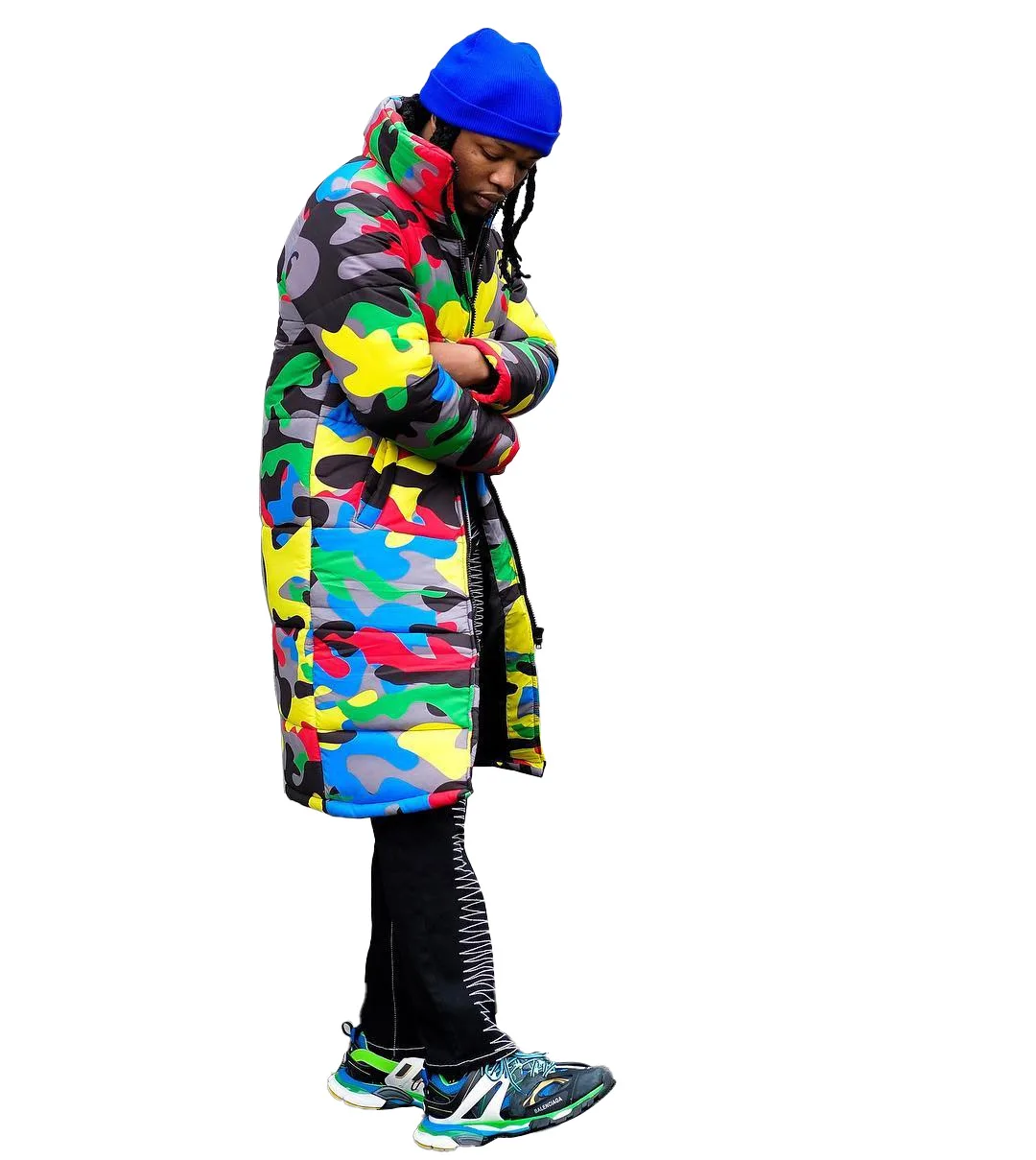 Длинный пуховик с высоким воротником, камуфляжный, с капюшоном, на молнии