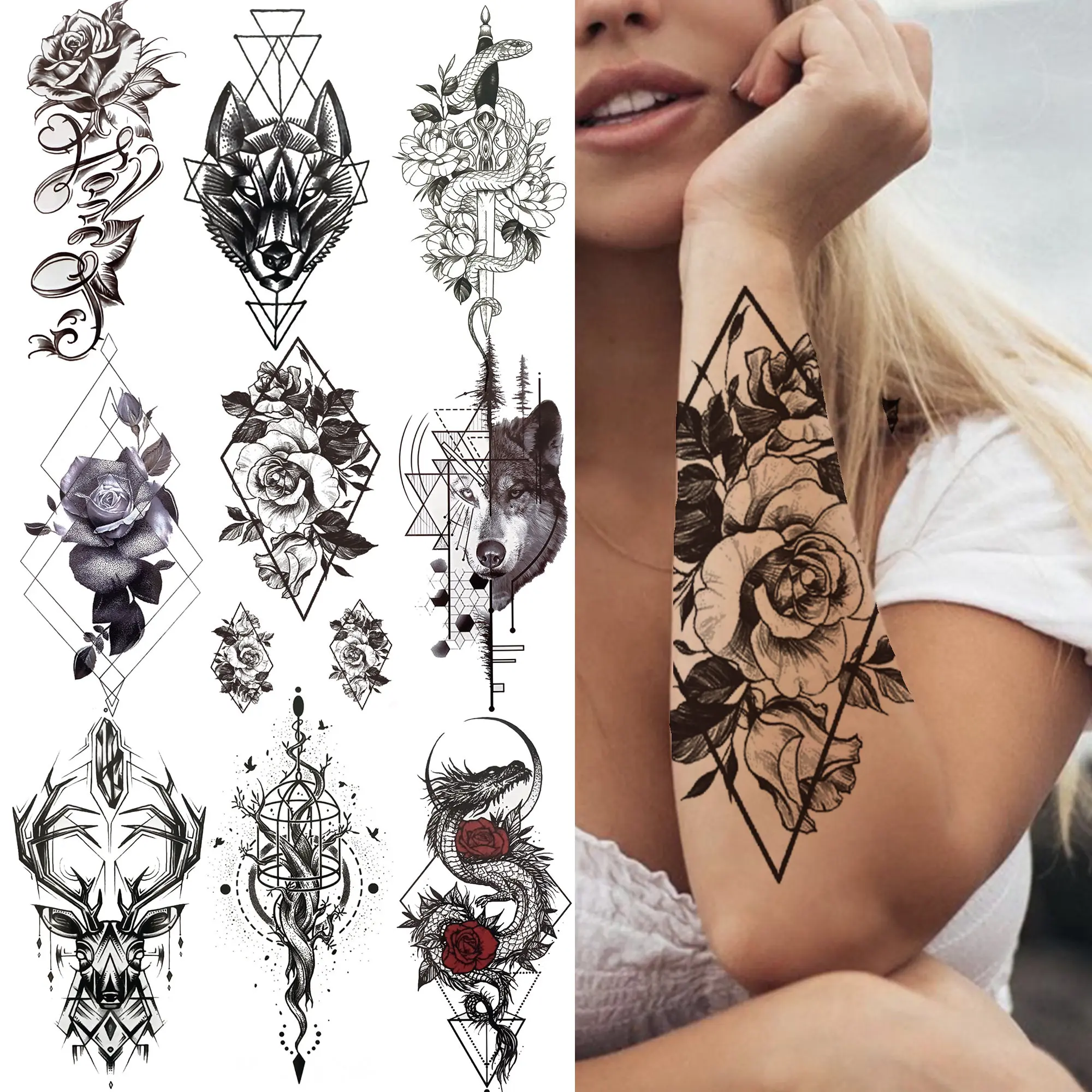 Временные татуировки для женщин и мужчин, наклейка с геометрическим цветком и розой, с волком, драконом, черным оленем, змеей, искусственные пионы, буквы, декор для татуировок