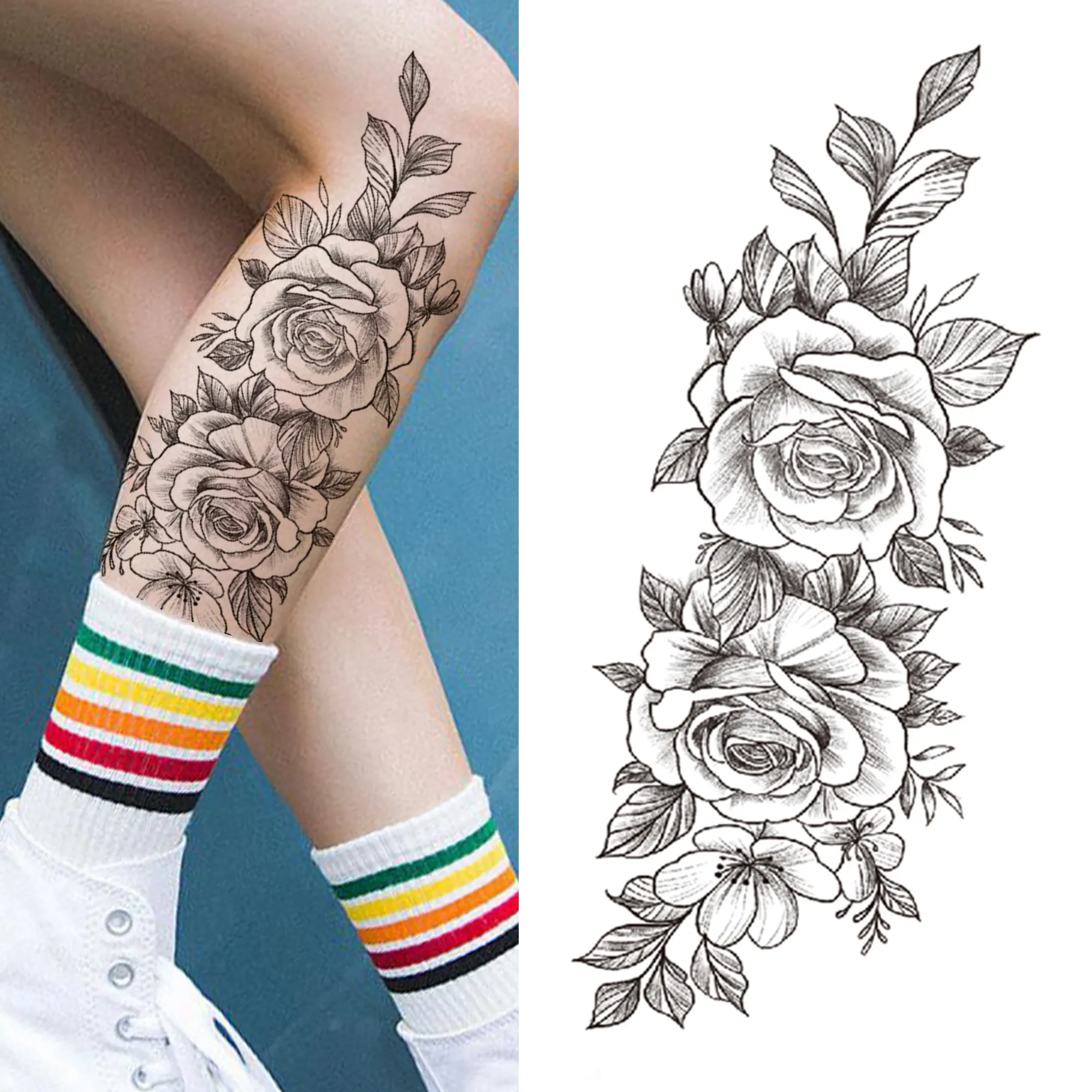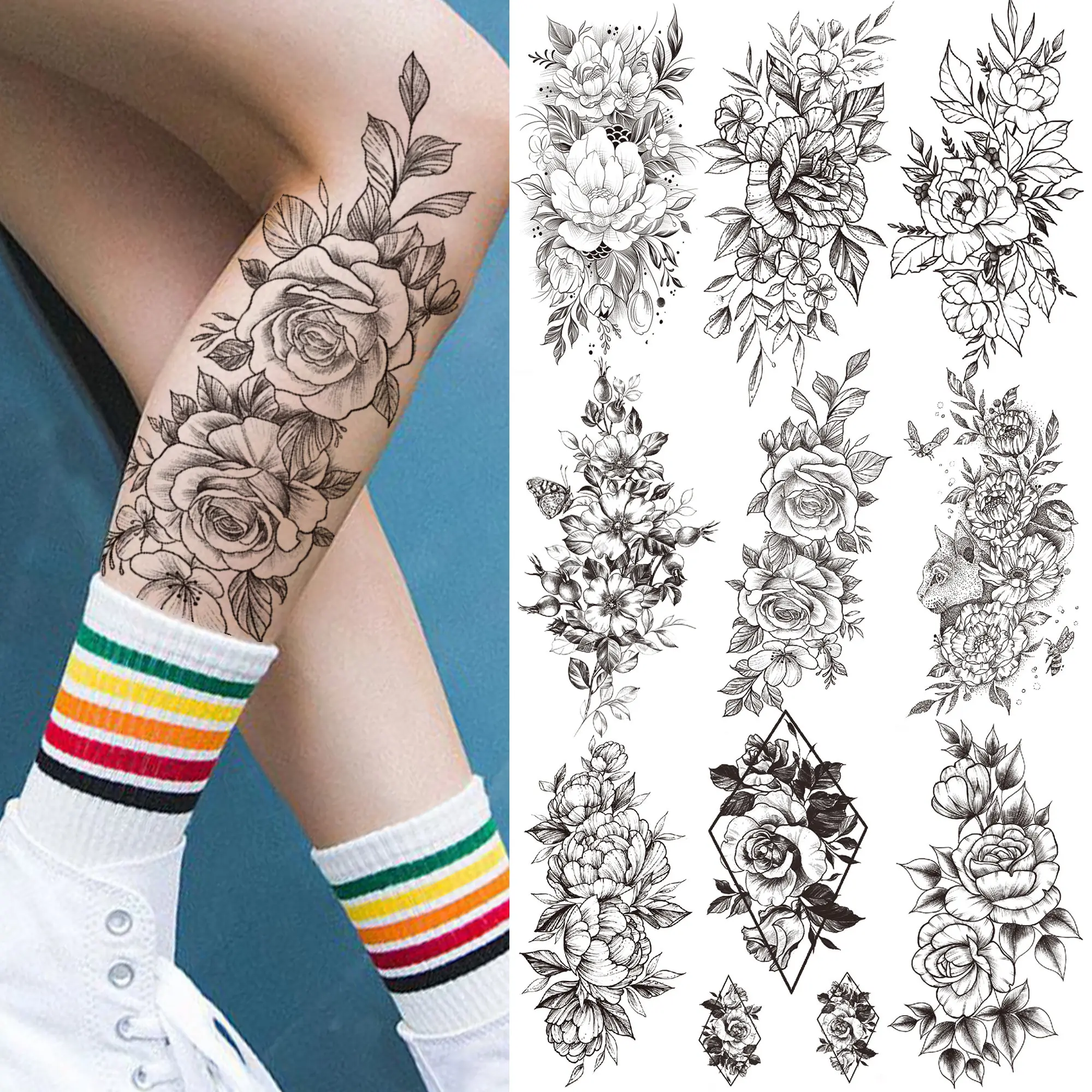 Черные цветочные Временные татуировки для женщин и девочек, Реалистичная поддельная наклейка-тату розы, геометрические пионы, водонепроницаемые тату