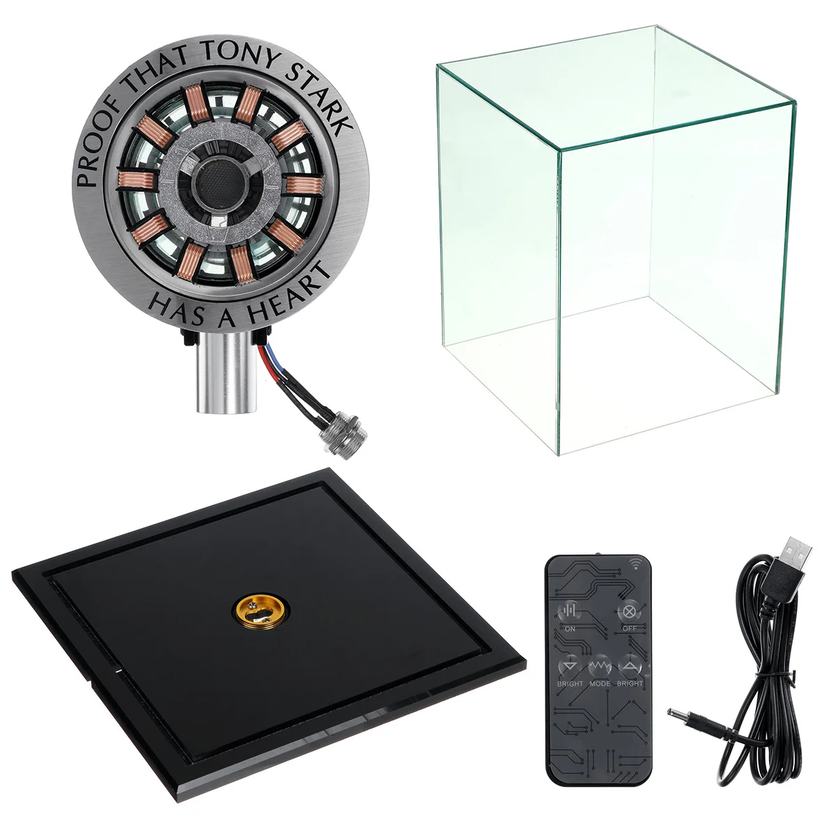 Посылка включает в себя:1x части дугового реактора1 основание1x пульт дистанционного управления1х витрина1x USB кабель