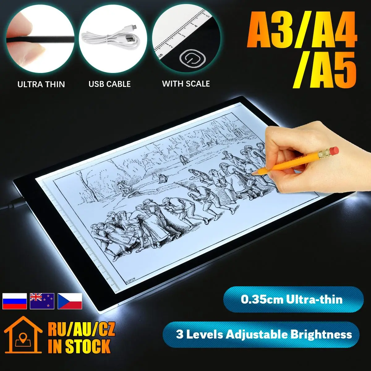 Спецификация:Материал: акрилТип: A3/A4/A5Светильник: A3: двойной светильник, A4: одиночный светильник, A5: одиночный светильникБусины лампы: А3: 90 шт., А4: 28 шт., А5: 11 шт.Рабочая Напряжение: 5V 1AНоминальная мощность: A3: 18 Вт, A4: 5,6 Вт, A5: 2,2 ВтЯркость: плавная регулировка яркостиРазмеры: A3:47*34,5 см A4 :26*24 см A5:21*15,5 см