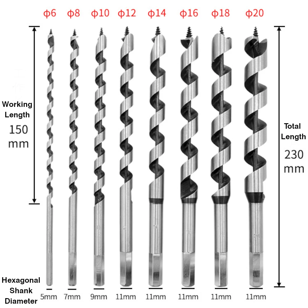 Набор сверл с шестигранным шнеком из углеродистой стали, 8 шт., 230 мм
