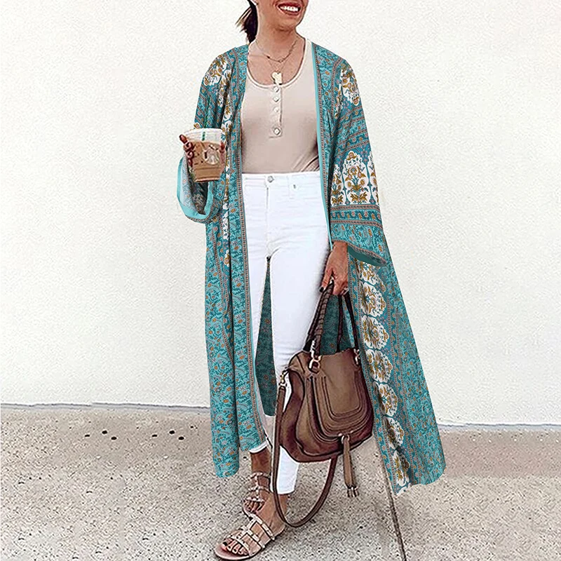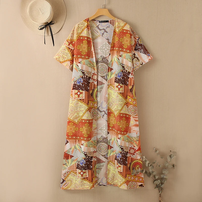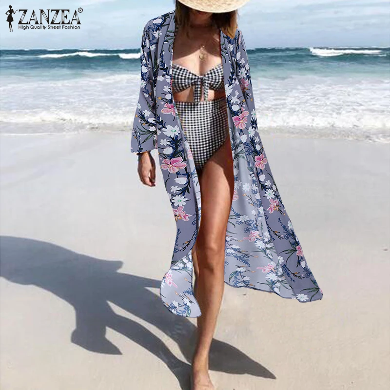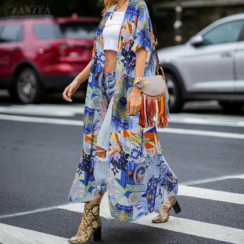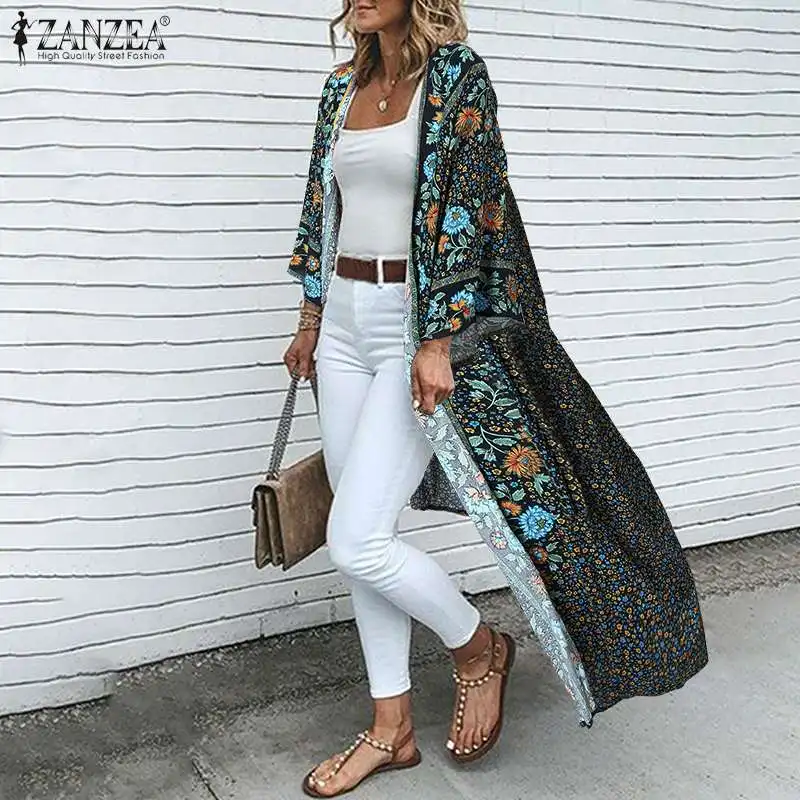 2022 кимоно ZANZEA с цветочным принтом, праздничный кардиган с открытой передней частью, Женская Повседневная накидка с длинным рукавом, топы, туника, блузки