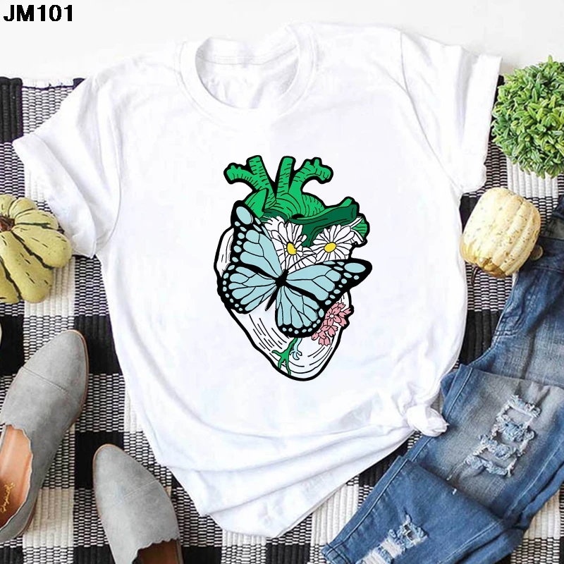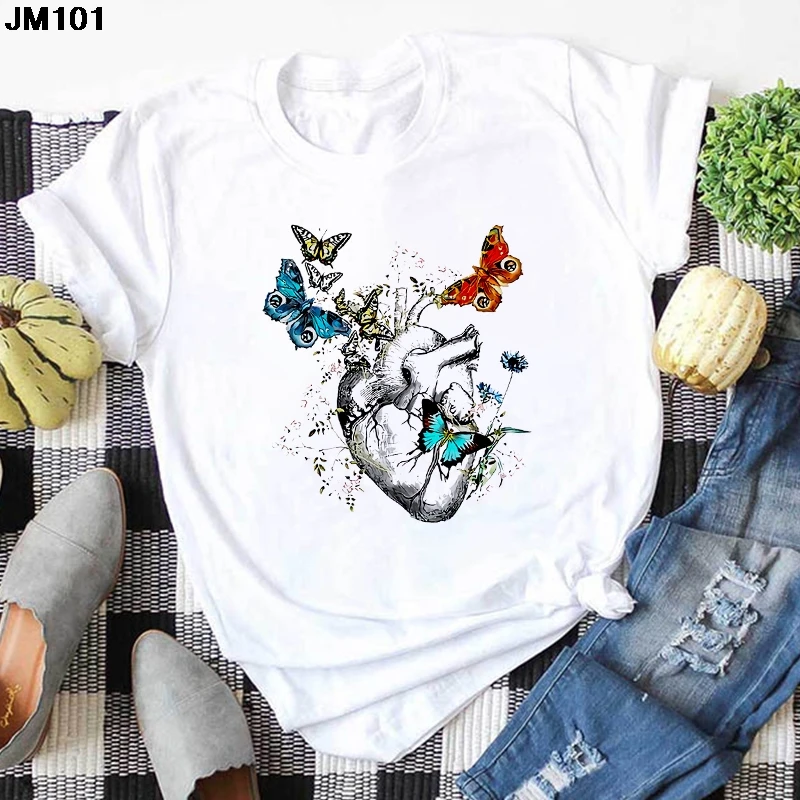 Футболка женская с принтом дерева и бабочки, Повседневная белая руб...