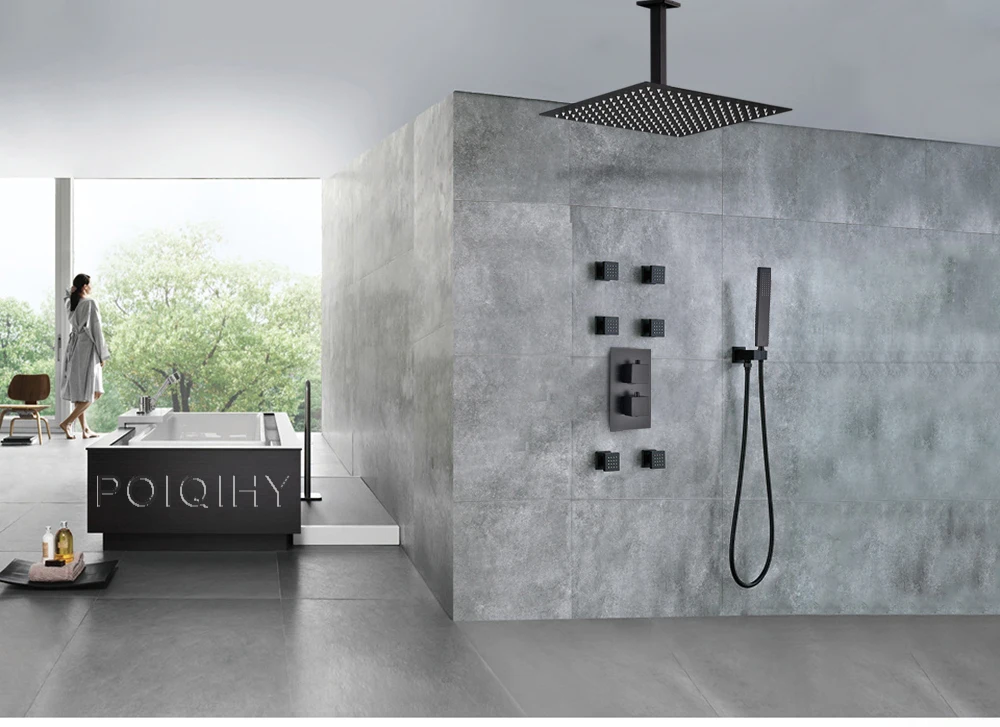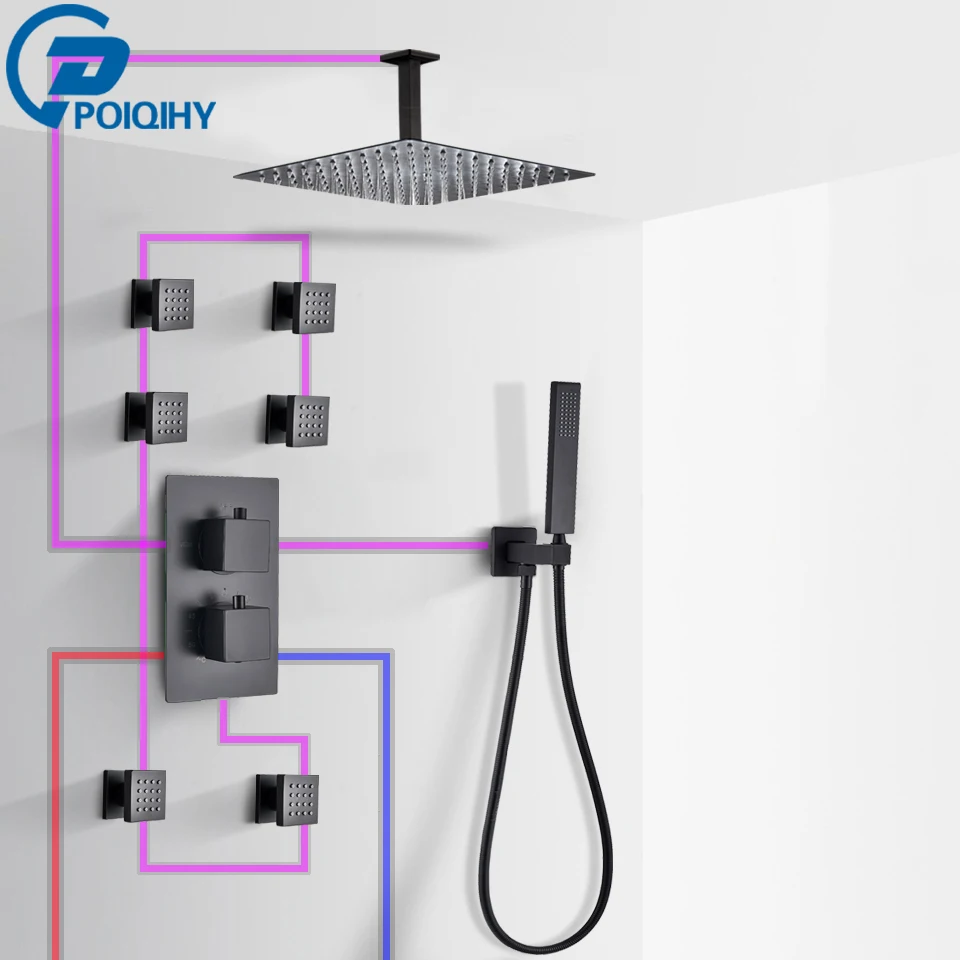 POIQIHY Ванная комната душевой набор матовый черный дождь смеситель для душа настенный потолку или стене термостатический клапан Системы для детей от 8 до 16 "Насадки для душа