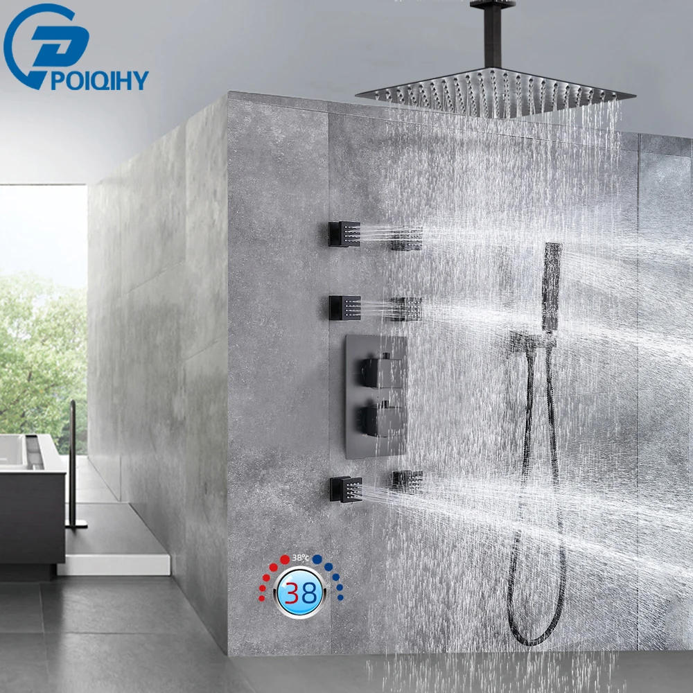 POIQIHY набор для душа для ванной комнаты матовый черный дождевой смеситель для душа настенный или потолочный термостатический клапан система 8-16 "душевая головка
