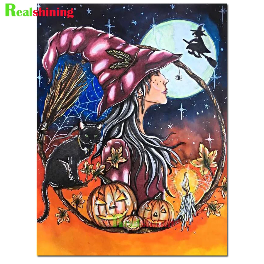 Полноразмернаякруглая 5d алмазная вышивка сделай сам с ведьмой и черной кошкой, алмазная живопись, Золотая Тыква, Хэллоуин, декор N1677