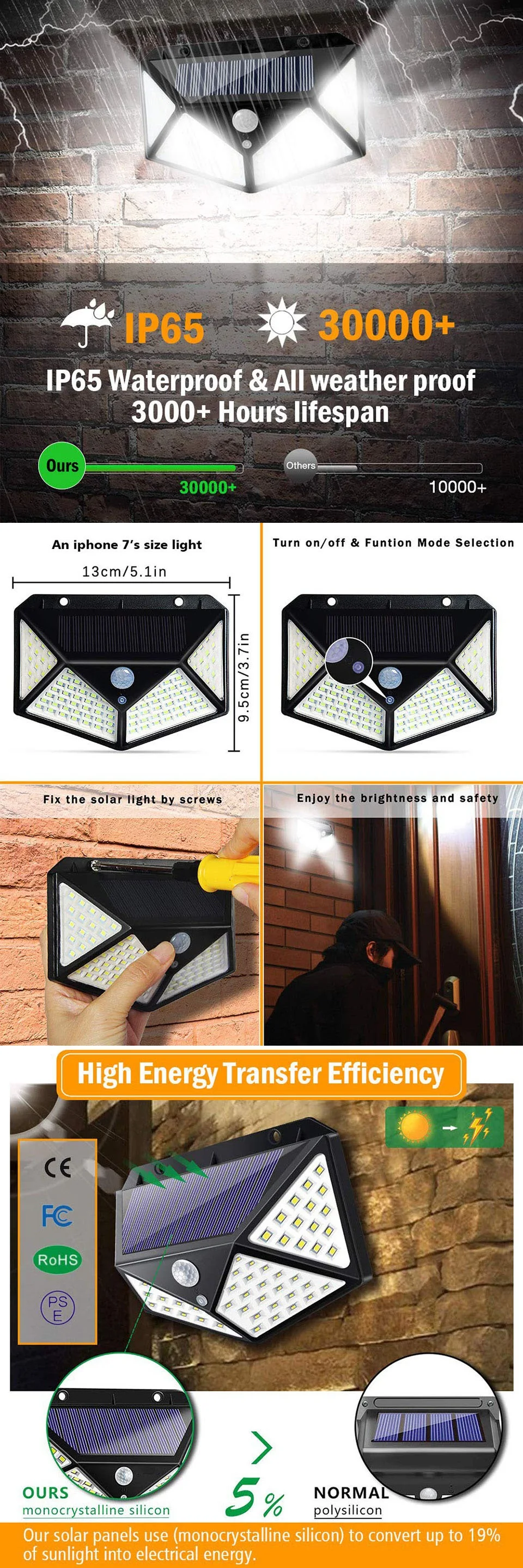 Различные типы солнечных ламп представлены ниже (Примечание: внешний вид и цвет продукта зависят от изображения):A0155643 -100 светодиодов/B1563340-100LED/N3900211-100LED/Q6011025-114LED:Черный A0155643: 100 светодиодный ламповый бисер, блок питания 1500MAЧерный B1563340: 100 светодиодный бисер, блок питания 2200MAЧерный Q6011025: 114 светодиодный ламповый бисер, блок питания 2400MAБелый N3900211: 100 светодиодный ламповый бисер, блок питания 1500MAХарактеристики светодиодный лампы: 100SMD2835 0,2 Вт/шт., 100-114Материал корпуса лампы: PC + ABSПанель солнечных батарей Технические характеристики: батареи из монокристаллического кремния 5,5 V 1,43 WСпецификация батареи: 18650 литиевая батарея 3,7 V 2200MAH, с защитой от заряда и разрядаВыход мощность: 3,2 V / 7 ВтВремя зарядки: 6 часов на солнцеУгол срабатывания PIR: 120 градусовРасстояние срабатывания: 8-10 метровРазмер продукта: 13*9,5*5 смРазмер упаковки: 13,5*8,5*8 смВес изделия: 195 гОсвещение кнопок режим:1. Выключение: режим выключения, светодиодный светильник красного цвета;Уровень 2: 1. Когда кто-то придет, светильник автоматически включится; Когда кто-то уйдет, светильник погаснет;Уровень 3 или 2: когда кто-то входит, светильник автоматически включается; Когда кто-то уходит, светильник будет ослаблен;4 и 3 шестерни: когда нет ни одного, светильник будет ослабляться и светиться в течение длительного времени.Преимущества 100 солнечных четырехсторонних настенных огней:100LED Солнечный водонепроницаемый четырехсторонний индукционный настенный светильник для человеческого тела, простой в эксплуатации, имеет световой светильник s, энергосбережение и защиту окружающей среды, зеленый светильник ing, длительный срок службы, долговечность, низкий уровень обслуживания, высокая стабильность без излучения и простая установка (Только 2 винта может использоваться для установки изделия фиксируется на наружной стены длительному воздействию прямых солнечных лучей), простых в использовании, интеллигентая (ый) светильник сенсорное управление, не нужно настраивать, энергосбережения и удобный, делает ваш дом более красивым и умным.Применение диапазон 100-светильник на солнечной батарее четырехсторонний настенный светильник:100LED Солнечный водонепроницаемый четырехсторонний индукционный настенный светильник для человеческого тела подходит для использования вне помещений, таких как коридоры, садовые ворота, крыши, внутренние стены, виллы, витрины, магазины, дома и т. д. Без проводки, без электричества, превосходное мастерство и уникальный вкус.100 вес лампы: 188 грамм (включая упаковку)Большой 114 легкий вес: 313 грамм (включая упаковку)