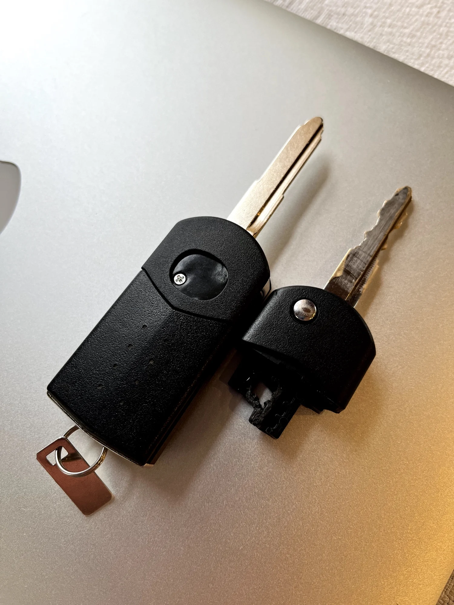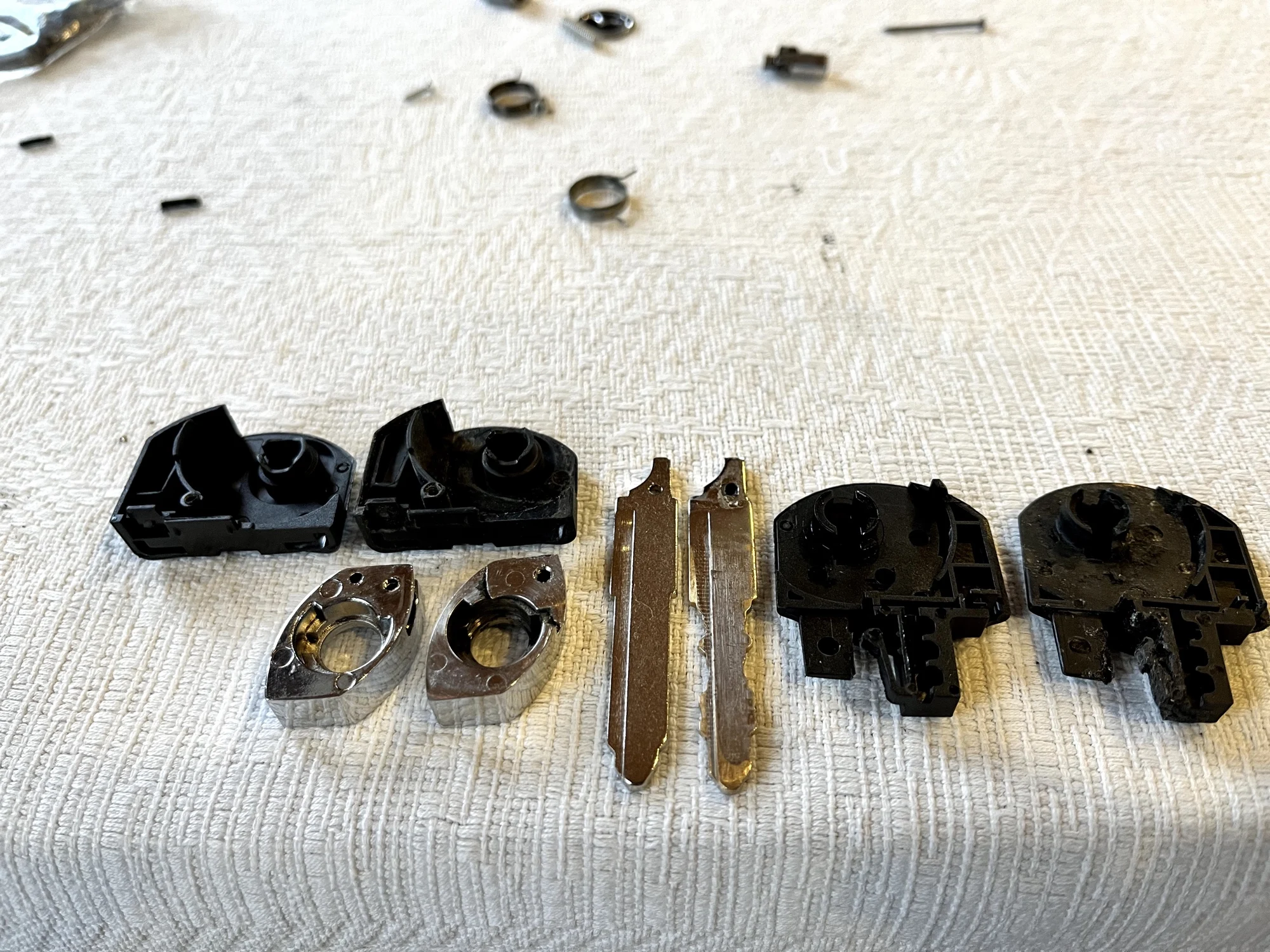 На моем ключе был сломан держатель жала и язычок фиксатора. Если ставить целиком верхнюю часть на оригинальный блок с кнопками зазоры кривые. Собрал из двух голов одну, без переставления чипа иммобилайзера. Механизм раскладывания смазал, работает.
