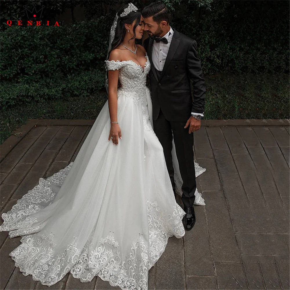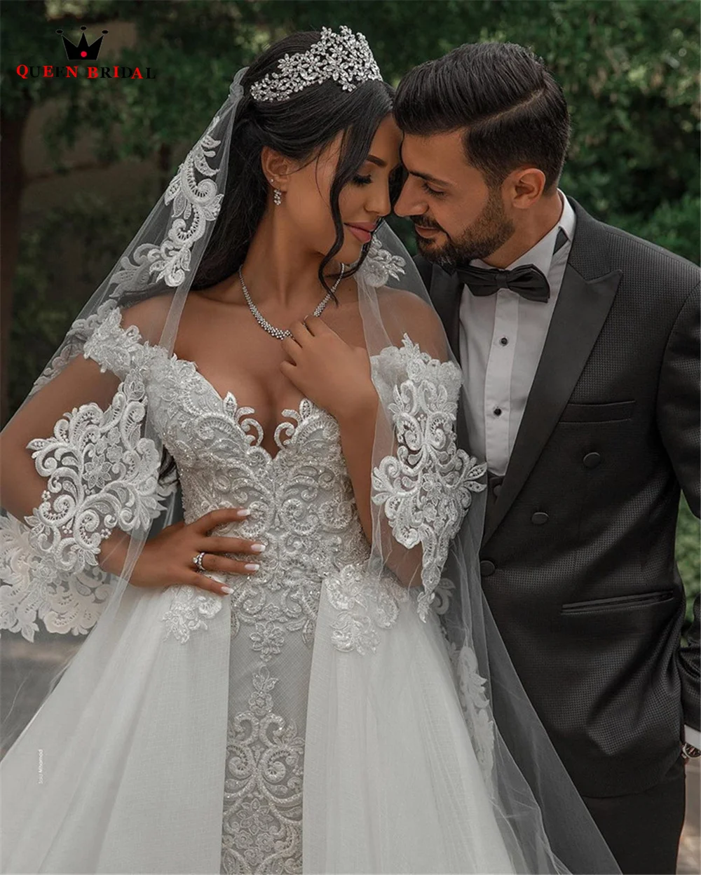 Женское длинное свадебное платье, со съемной юбкой и V-образным вырезом, кружевное, тюль, расшитый кристаллами и бисером