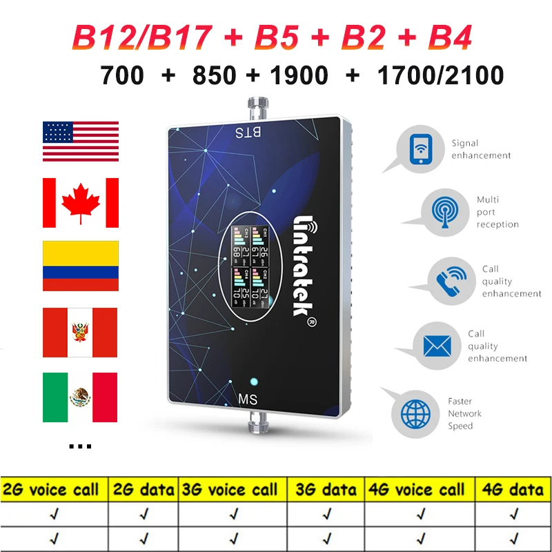Усилитель сигнала 2G 3G 4G Cell мобильный телефон 700 850 1700 1900 GSM CDMA B5 AWS B4 PCS B2 1900 МГц Ретранслятор 70 дБ AGC