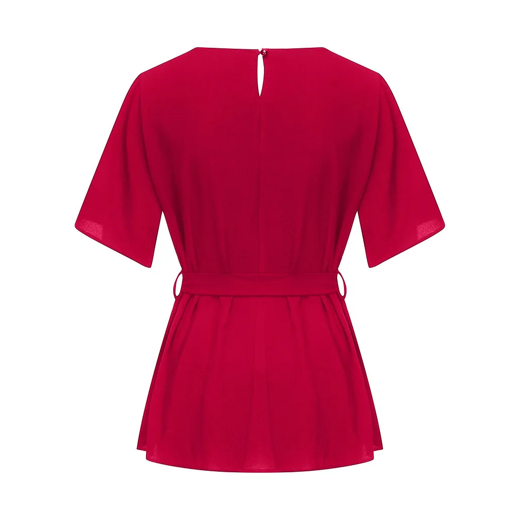 Женская Однотонная рубашка с коротким рукавом размера плюс с поясом Блузка-топ