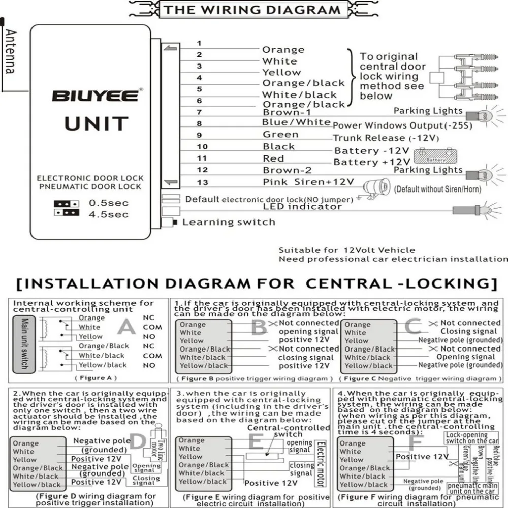 Особенности: 1. Замок: нажмите кнопку «LOCK» на пульте дистанционного управления один раз, светильник для парковки Вспышка один раз, сирена звучит один раз, центральный дверной замок автоматически. Светодиодный индикатор мигает один раз в секунду. (По умолчанию нет сирены без звука) 2. Разблокировка: нажмите кнопку «разблокировать» на пульте дистанционного управления, светильник для парковки Вспышка дважды, сирена звучит дважды, центральная дверь разблокировка автоматически- Cally, светодиодный индикатор будет закрыт. 3. Поиск автомобиля: нажмите кнопку «звонок» на пульте дистанционного управления один раз, парковочный светильник Будет мигать 30s, звук сирены, нажмите ту же кнопку снова Остановится; Если нет, нажмите кнопку блокировки много раз. 4. Электронный дверной замок/пневматический дверной замок: Основной блок по умолчанию электронный замок. 5. Обучение: обучение: Нажмите кнопку обучения один раз, Поворотный Светильник мигает один раз, после нажатия кнопки Был изучен, если нужно научиться более удаленно, Повторите это Снова. 6. Ясно: нажмите переключатель обучения 3 секунды поворота Светильник 3 раза был очищен. 7. Выходная мощность окна (-25s) Нажмите кнопку «lock» один раз, поворачивая свет мигает один раз и дверь Блокировка, теперь выход сигнала окна питания отрицательный Триггер 25s, функция зависит от задержки автомобильной цепи. 8. Выпуск багажника (-3s,50mA) Нажмите кнопку «unlock/ trunk /mute» на дистанционном передатчике 3 секунды, чтобы отпустить багажник во время парковочных огней Будет мигать три раза. Он поддерживается приводом и реле. Спецификация: Основной блок: Рабочее напряжение: 12 ± 3 В постоянного тока Статический ток: 8,5 мА Поворотный Светильник: 7,5 A x 2 Центральный замок: 10A/433,92 Рабочая частота: 433,92 МГц Пульт дистанционного управления: Рабочее напряжение: 12 В постоянного тока Средний Статический ток: 0 мА Управление Размер коробки: 8,6x6,6x2,6 см Размер упаковки (Д х Ш х В): Размер пульта дистанционного управления: 9,8x3,8x1 см Размер упаковки (Д х Ш х В): Вес: 0,22 КГ Размер упаковки: 125*92*75 мм, 50 шт/Кантон, размер кантона: MEAS:41*34*40 см Об установке: Продукт должен быть установлен профейсионилами с электриком автомобиля Сертифицированный Для детей возрастом от 12V DC автомобиля, который имеет центральный дверной замок Товар без привода центрального дверного замка Посылка включает: 1 Главный блок управления 2x пульт дистанционного управления 1x набор проводов 1x светодиодный индикатор 1x Руководство пользователя на английском языке