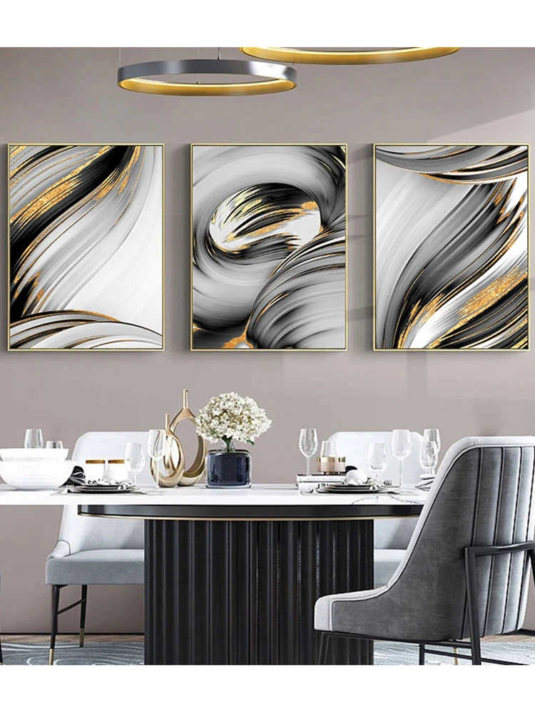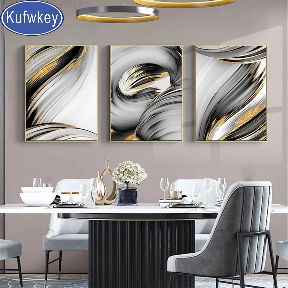 3 шт. алмазов картина камни в форме ромба абстрактный черно-золотой линией Алмазная вышивка круглый дрель мозаика серая волновая Триптих,