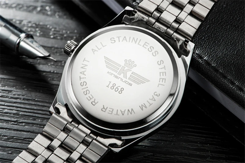 Часы имеют отметку водонепроницаемости 30 м. Это означает, что он может выдерживать небольшие брызги, но нельзя мыть или носить во время купания, плавания или дайвинга. Бренд: KINGNUOS Модель: 1853 Размер циферблата Диаметр циферблата: около 40,5 мм Толщина: около 9 мм Размер ремешка Длина мужского ремешка: около 24,0 см Ширина: около 2,2 см Механизм: кварцевый механизм Материал циферблата: стрелка из нержавеющей стали, зеркало из высококачественного минерального стекла Материал ремешка: высококачественный импортный стальной ремешок, складная страховка, Описание функции: отображение 12 часов, календарь, дата Водонепроницаемость: 30 м Водонепроницаемость Пол: для мужчин Посылка: 1 x часы Вес: прибл. 90 г