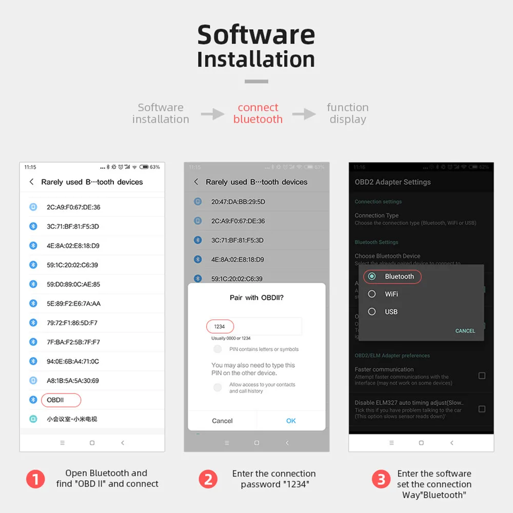 О: на телефоне android:1. Откройте «Настройки» вашего android и найдите BT из ELM327:OBDll, затем введите пароль 1234.2. Откройте крутящий момент -- etting --- адаптер OBD2 Settins --- Тип подключения --- BT --- back --- ChooseBT устройство --- OBDII[AA:BB:CC:11:22:33].