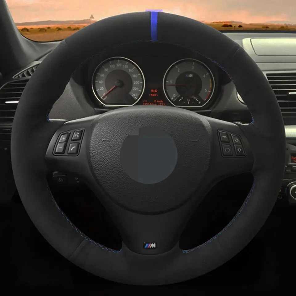 Чехол рулевого колеса автомобиля черного цвета из натуральной кожи и замши, Синий Маркер для BMW M спортивные M3 E90 E91 E92 E93 E87 E81 E82 E88 X1 E84 Запчасти