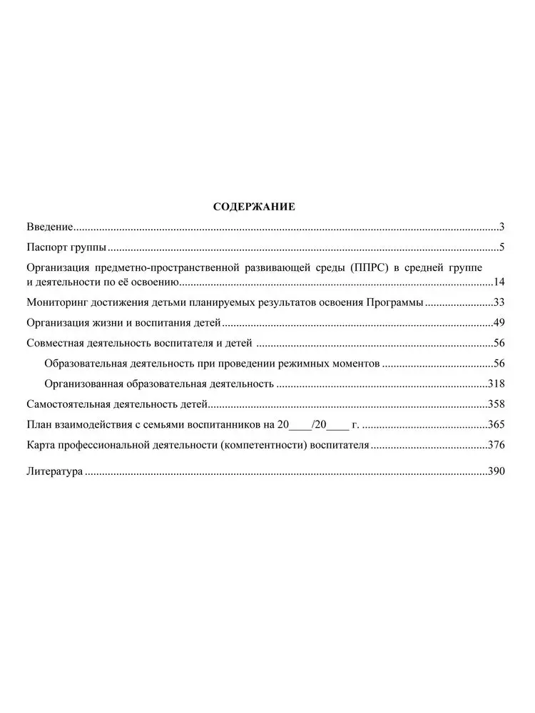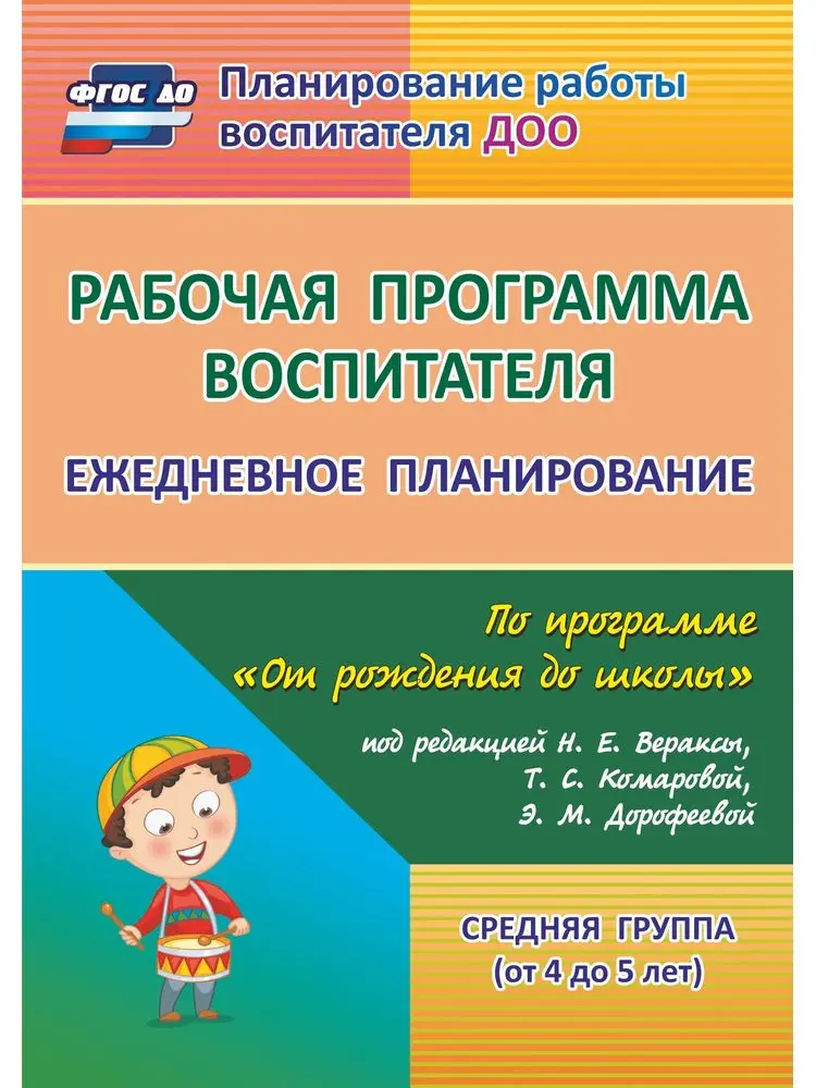 В пособии представлена модель рабочей программы деятельности воспитателя, разработанная в соответствии с ФГОС ДО по инновационной программе дошкольного образования "От рождения до школы" под редакцией Н. Е. Вераксы, Т. С. Комаровой, Э. М. Дорофеевой (М.: Мозаика-Синтез) для средней группы (от 4 до 5 лет), охватывающая весь комплекс содержания и организации жизни и воспитания детей в условиях ДОО, планирование культурно-досуговой, совместной деятельности воспитателя и дошколят, взаимодействия с семьями воспитанников. Предложена карта профессиональной компетентности воспитателя, включающая план саморазвития, самообразования, копилку достижений, самодиагностику, составленная в рамках задач ФГОС дошкольного образования и в контексте Профессионального стандарта педагога.